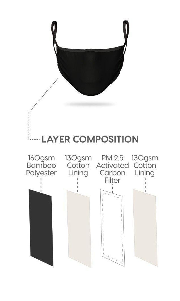 Fabric: 160gsm Bamboo Polyester, 130gsm Cotton Lining, 130 Cotton pocket, 190gsm Lycra Binding, Elastic straps and PM 2.5 Activated Carbon mask filters (PP anti-sticking cloth, meltblown cloth and activated carbon cloth)