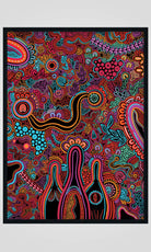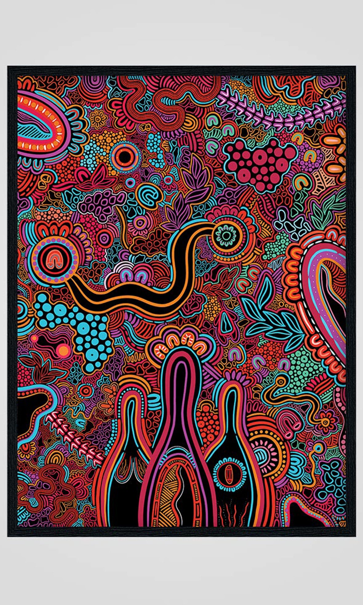 Within the artwork you will notice that I have placed people standing at the front. This represents our Elders who have paved the way for our communities and families. This acknowledges all the work our Elders have put into our communities and shows appreciation for their hard work, support, guidance, nurturing and love. The background represents the lands we walk on and are connected to.