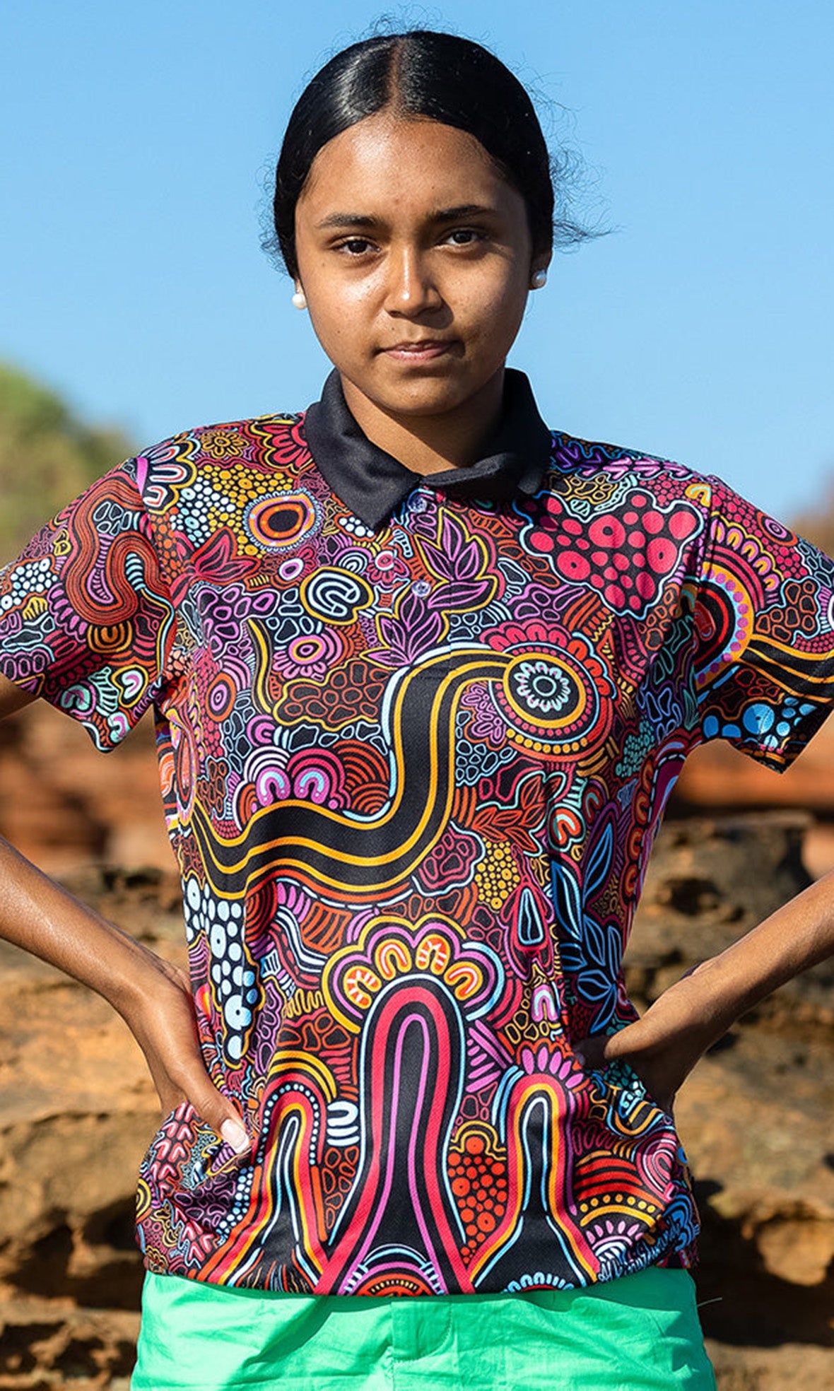 These kids polos feature beautiful designs based on the theme “For Our Elders”. This theme is an acknowledgement and a celebration of all the Elders past and present who have contributed so much to their communities and families.