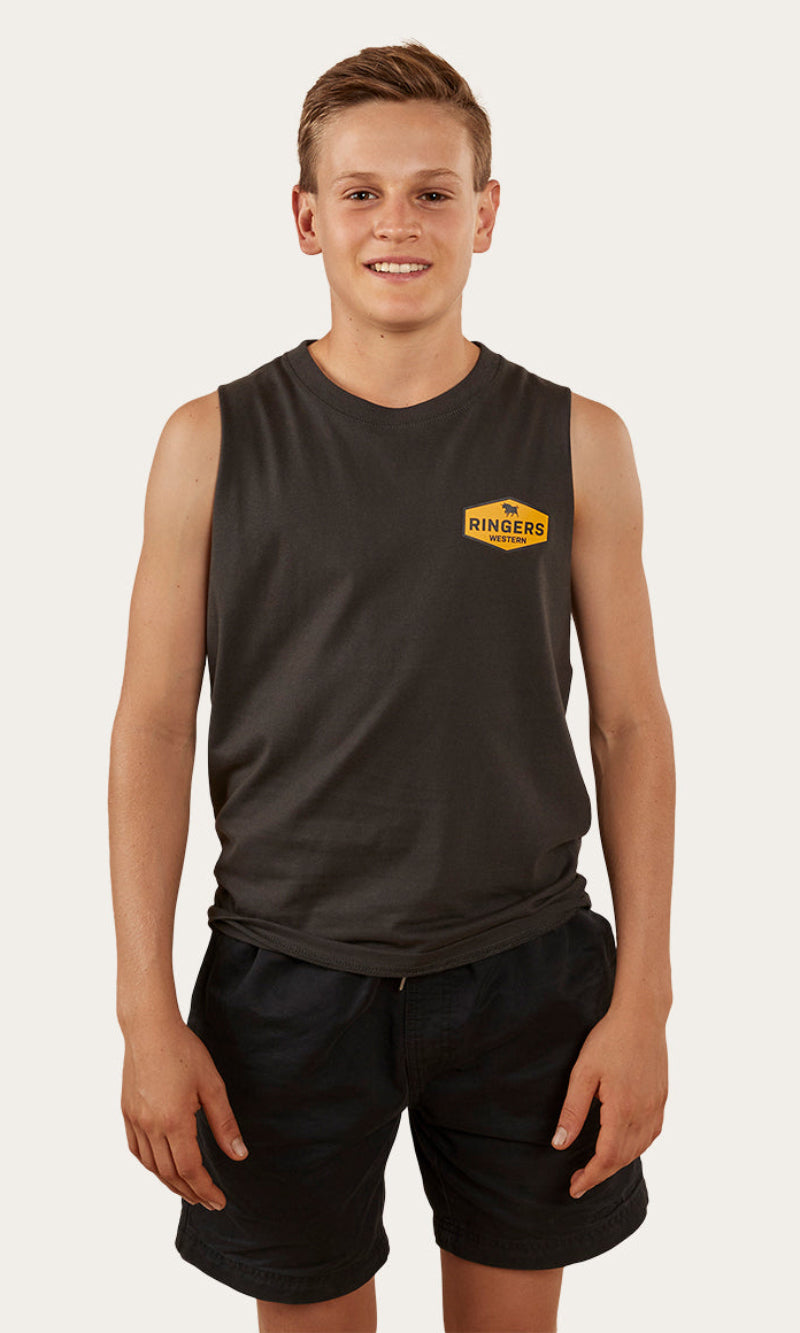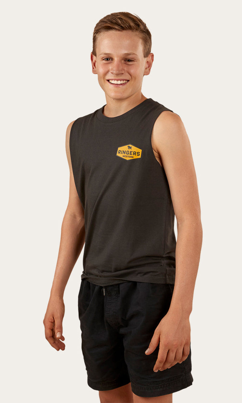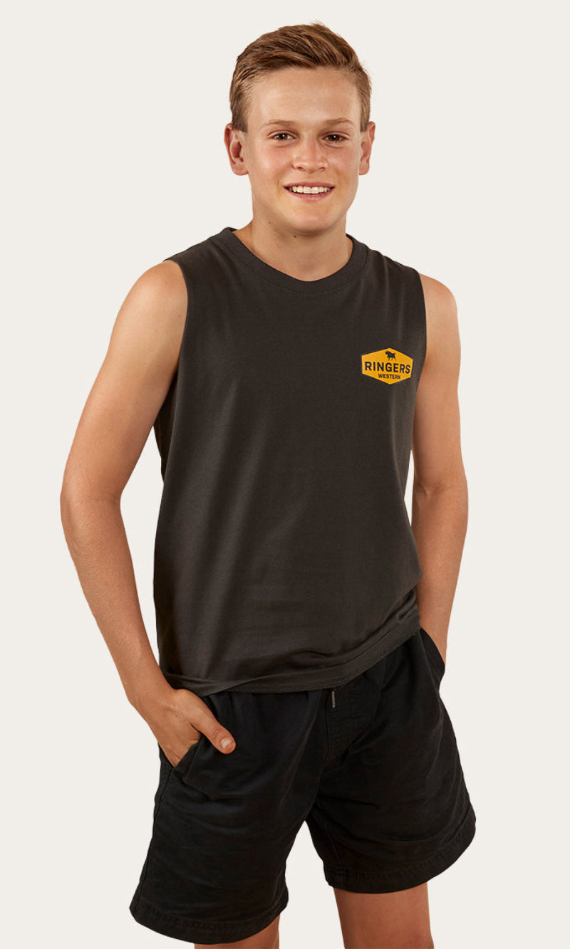 The same Servo print you all know and love on a muscle tank. Designed for those who embrace everything country, this muscle tank combines strength and style in a way that's unmatched. This kids classic fitting muscle tank is made from 100% cotton which is a natural fibre known for its softness, breathability and durability. Made to keep you cool under the hot Aussie sun. The raw edges add a touch of ruggedness, perfect for our mini cowboys and cowgirls. If you are after comfort, this muscle tank has you covered.