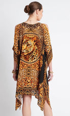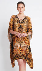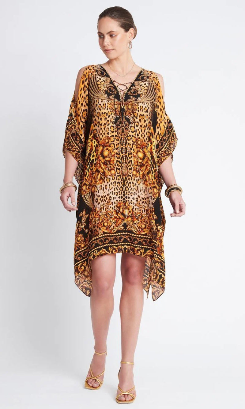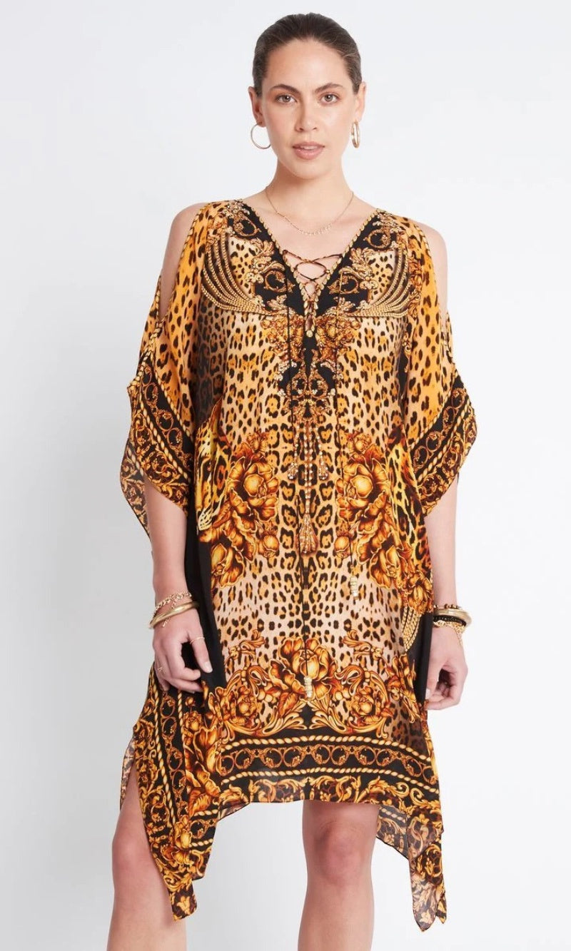 The Golden Lady Short Kaftan Dress w Slit is a signature Czarina shape featuring v-neck, cut out shoulders with a dropped arm hole and border detailing throughout. If you’re a fan of a kaftans, you won’t want to miss this. Styles effortlessly as a mini dress with flats or heels, or style as a top with skirts and pants.