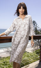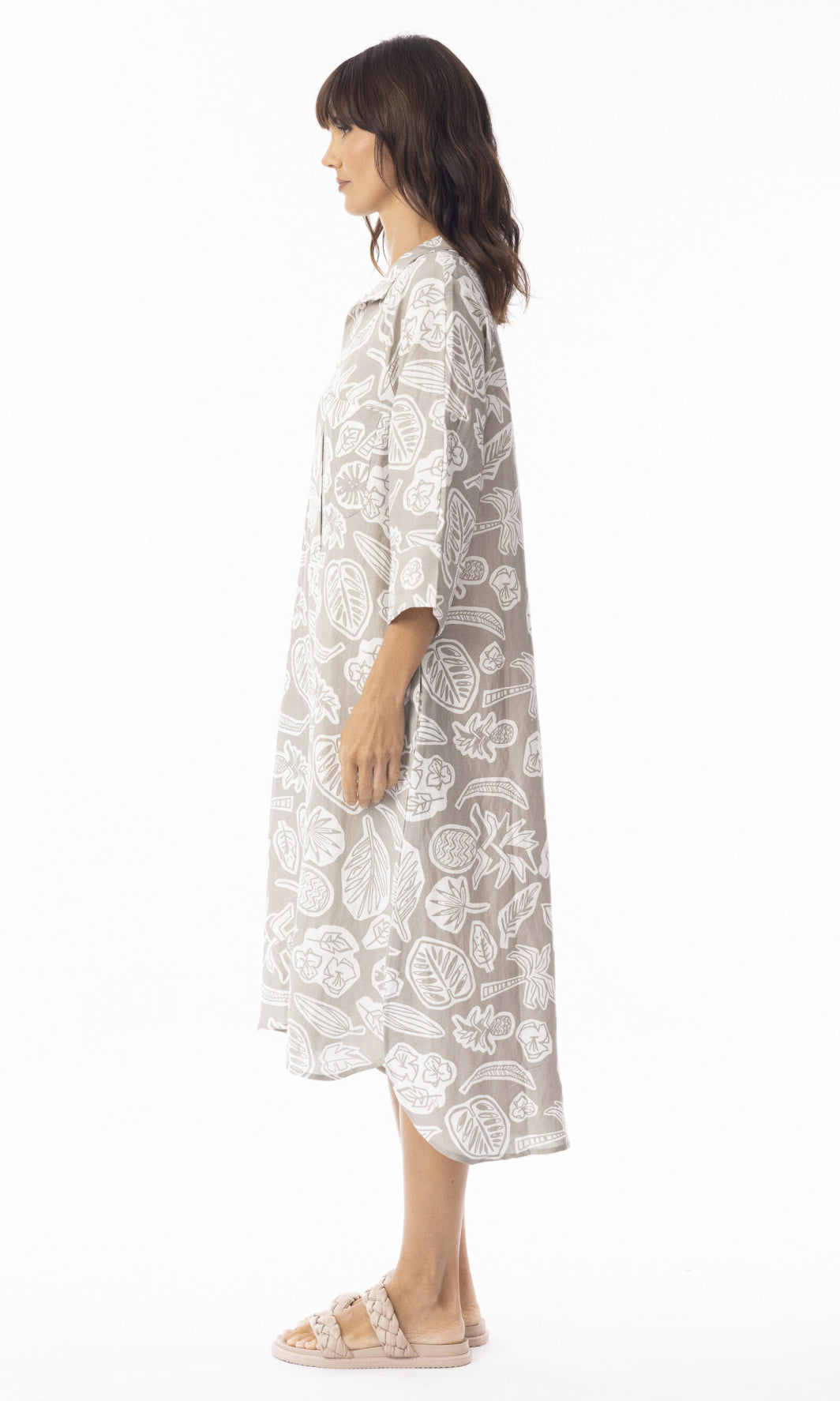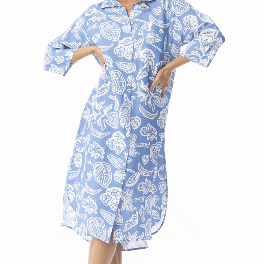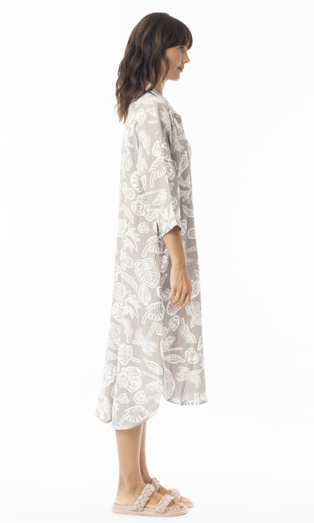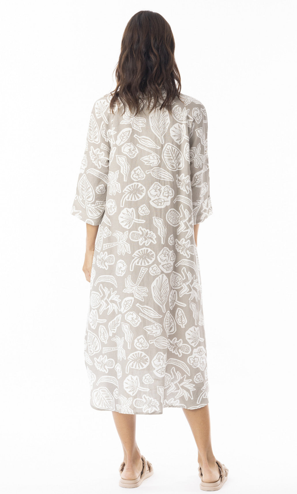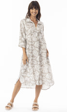 Let distant dreams come alive through the twilight-hued Linen Print Sand Midi Collar Shirt Dress. Crafted from breathable linen, this versatile piece features a fun cut out palms print, vibrant colour, a crisp collar, full-length button placket, and practical side pockets. Perfect for any occasion, it transitions seamlessly from day to evening, ensuring you look effortlessly chic wherever you go.