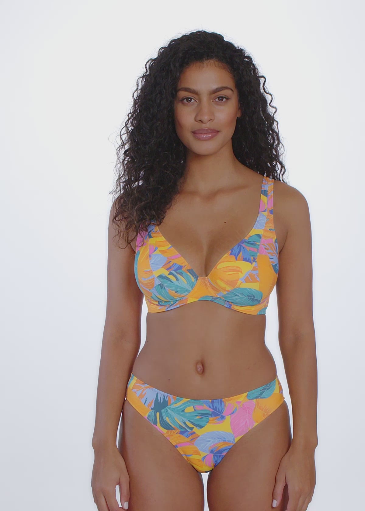 Soak up the tropical sun and hit the waves with Aloha Coast. An oversized colour block palm combines vibrant mangos, hot pinks, ocean blues and luscious greens for the ultimate summer collection. Featuring core styling on a fabric containing recycled yarn for the perfect holiday vibe!