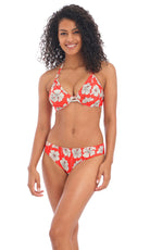 No cloudy days can dampen the bold colour story of all-new Hibiscus Beach. The sunset-toned red ground is every inch as vibrant as it looks, and features a sketchy design of tropical flowers in bloom. Look out for the super cute shell-shaped gold charms on select styles too, including the UW Halter Bikini Top and Tie Side Bikini Brief - we think they make the perfect combo!
