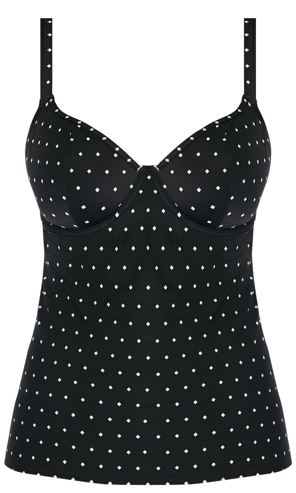 Poolside confidence is yours with Jewel Cove. A contemporary twist on a classic polka dot design, the repeat diamond print stretches across an Black ground.
