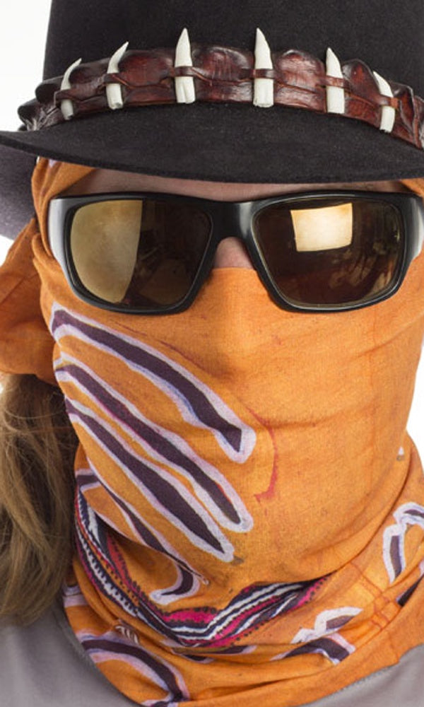 This Headsox design by Martumili artist Nancy Chapman portrays a part of the Minyi Puru (Seven Sisters) story from the Jukurrpa (Dreamtime). This is a very significant story that travels a very long way around the country. The Seven Sisters are running away from a man who is chasing them. They have travelled all the way from Roebourne to get to Parnkarl where they stopped for a while before flying off again. Enjoy!