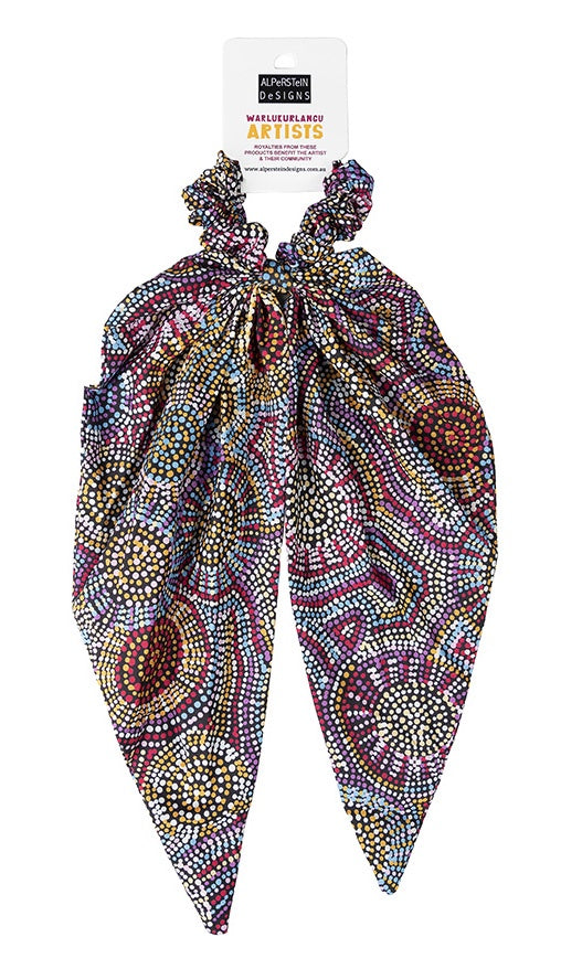 Cotton Hair scrunchies featuring artwork from Warlukurlangu Artists.
