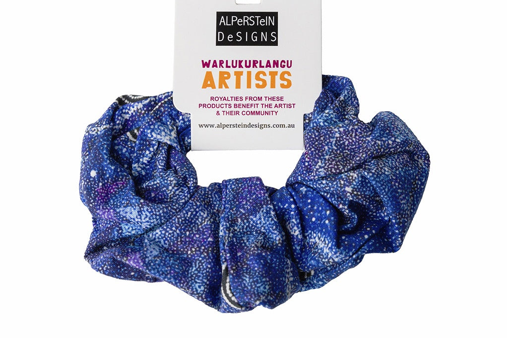 Cotton Hair scrunchies featuring artwork from Warlukurlangu Artists.