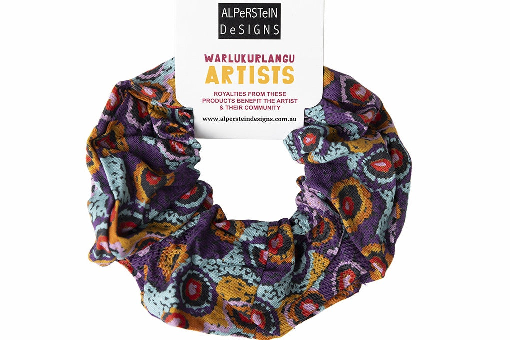 Cotton Hair scrunchies featuring artwork from Warlukurlangu Artists.