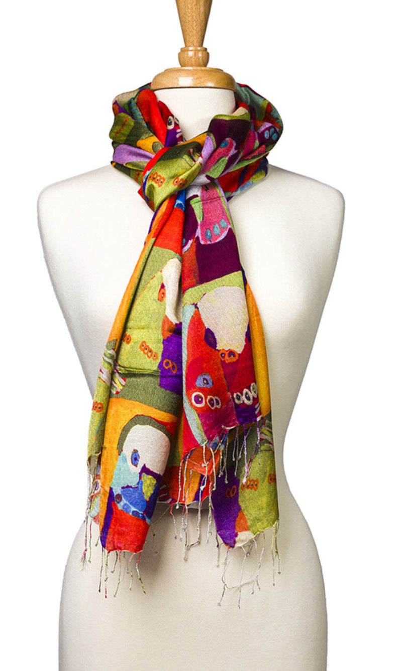 Silk Scarf featuring artwork by Karen Barnes from Warlukurlangu Artists. Packaged with information about the artist and artwork.