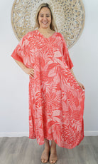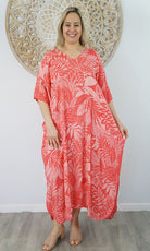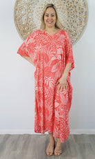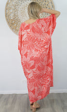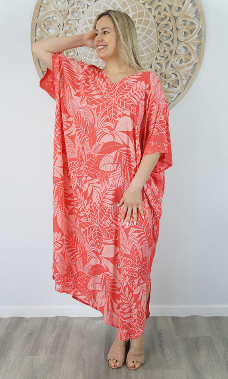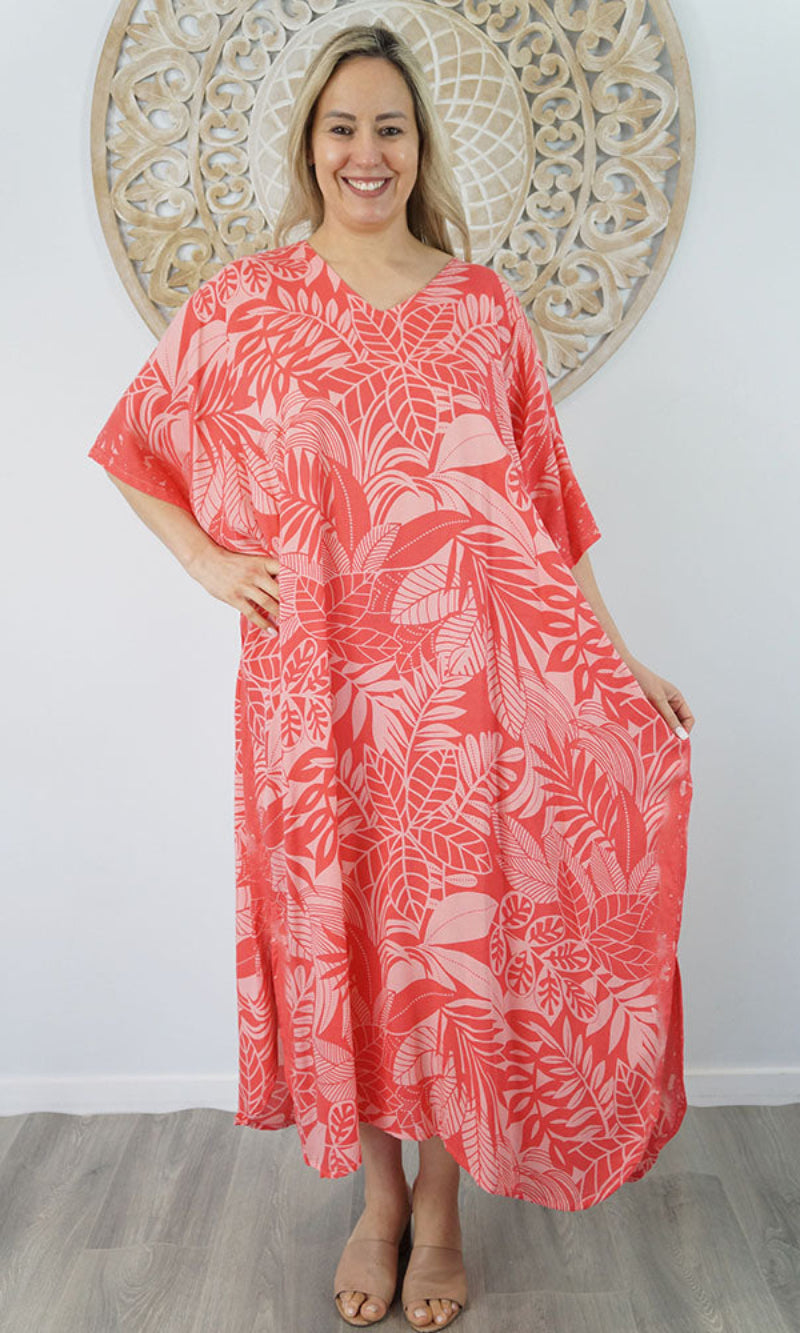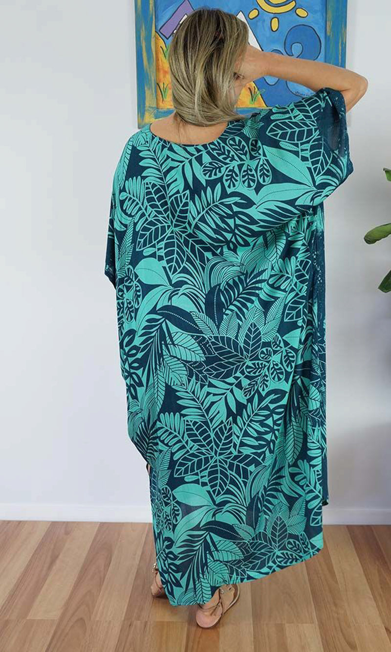 This light rayon kaftan makes a wonderful gift. One size fits size 10 to 26 comfortably. Has side splits at the bottom. Finished length is approximently 125cms.