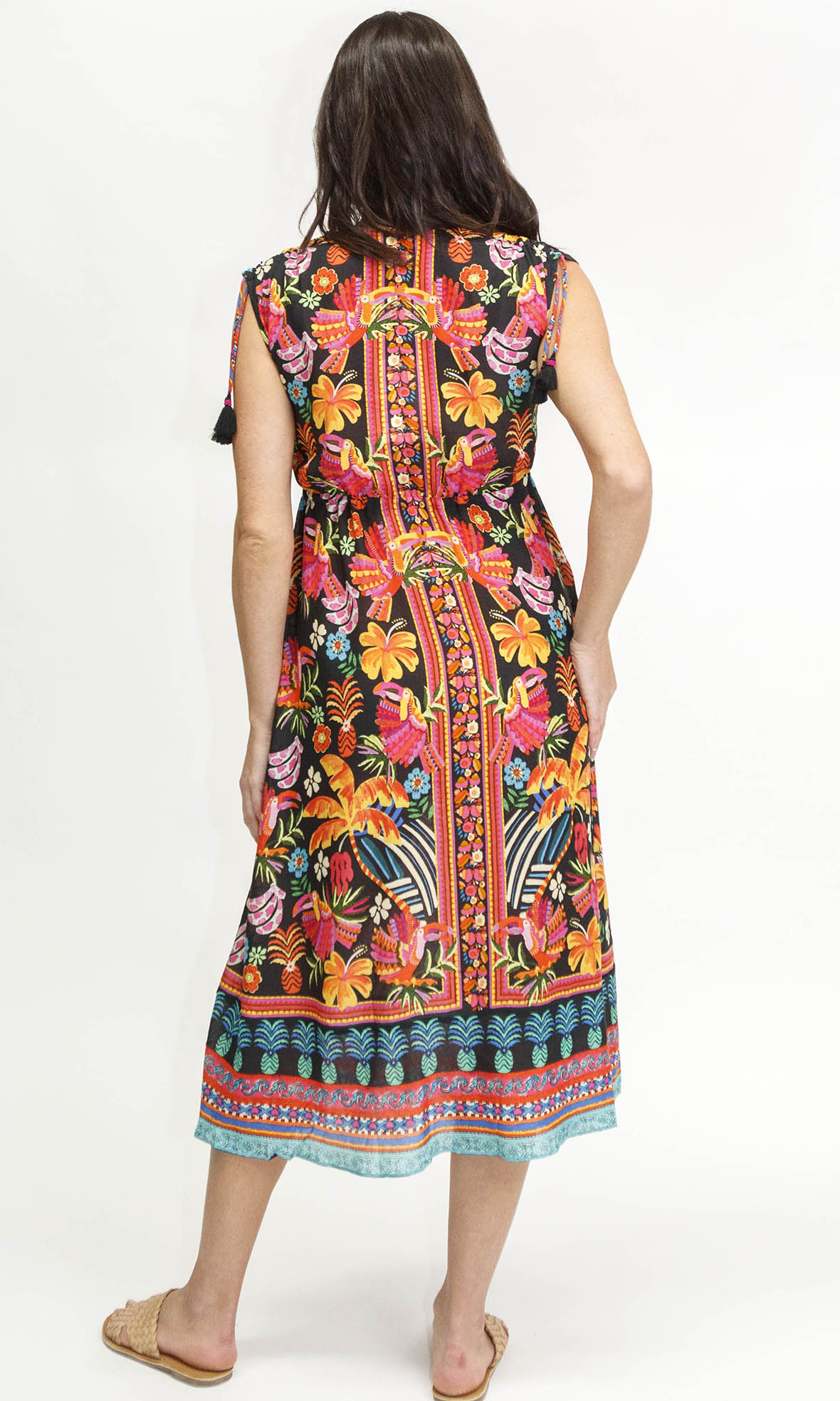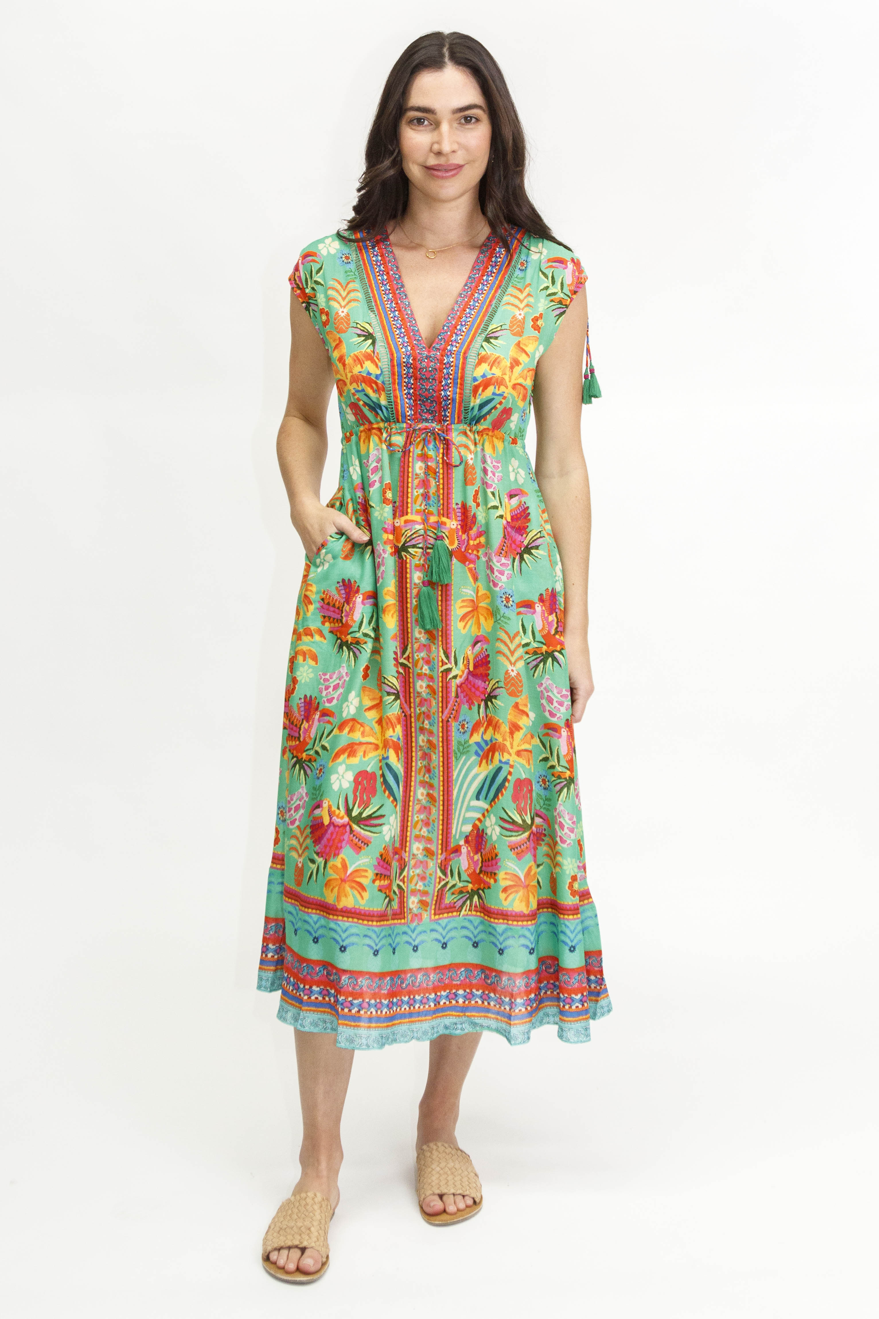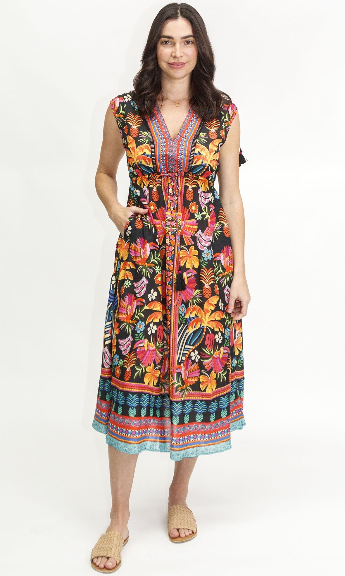 Look chic and feel comfortable in the Lulasoul Brasilia Midi dress. Featuring an adjustable drawstring waist, sleeveless design, and pockets, this dress achieves the perfect balance of style and practicality. Wear it from day to night and enjoy the effortless timeless elegance this dress provides.