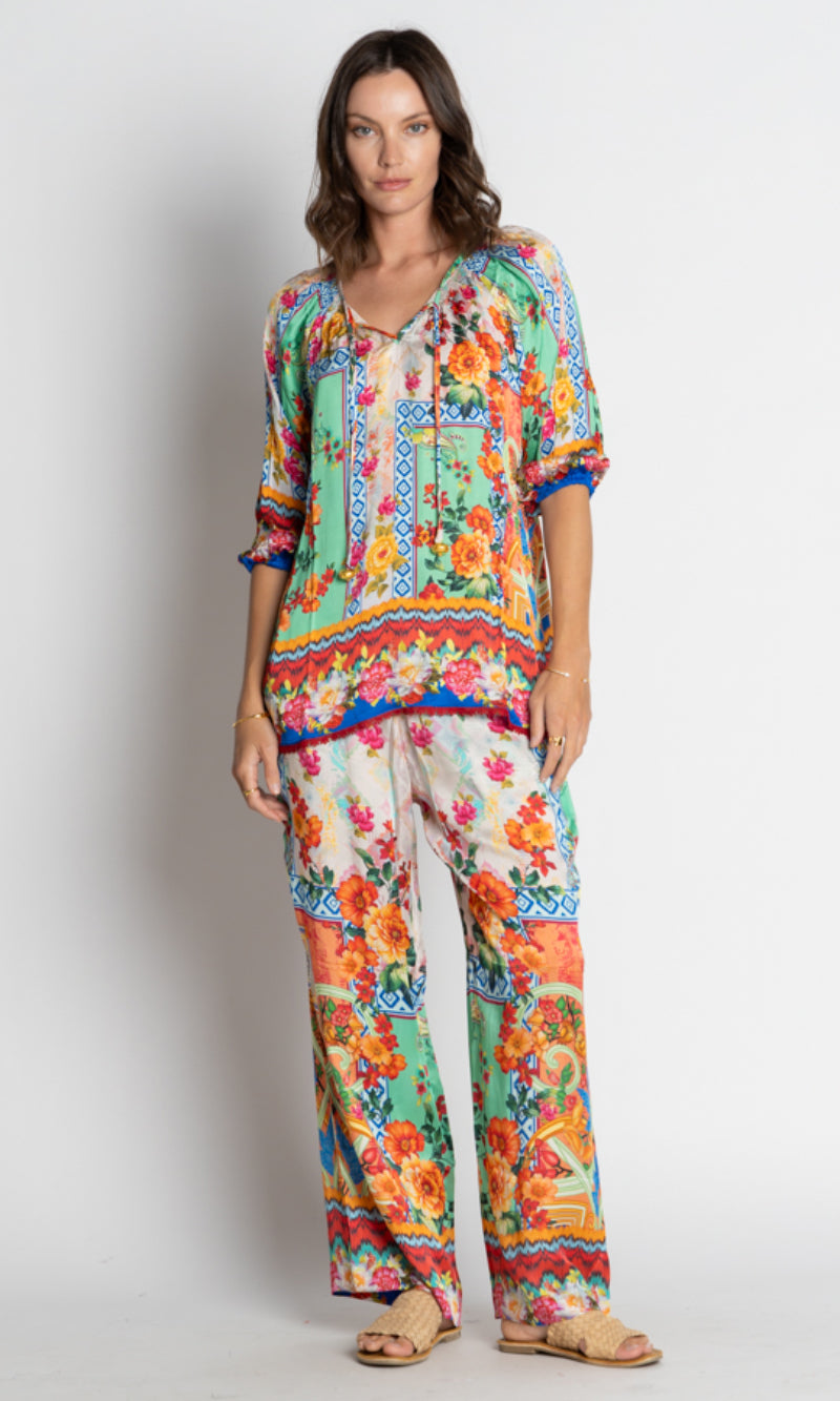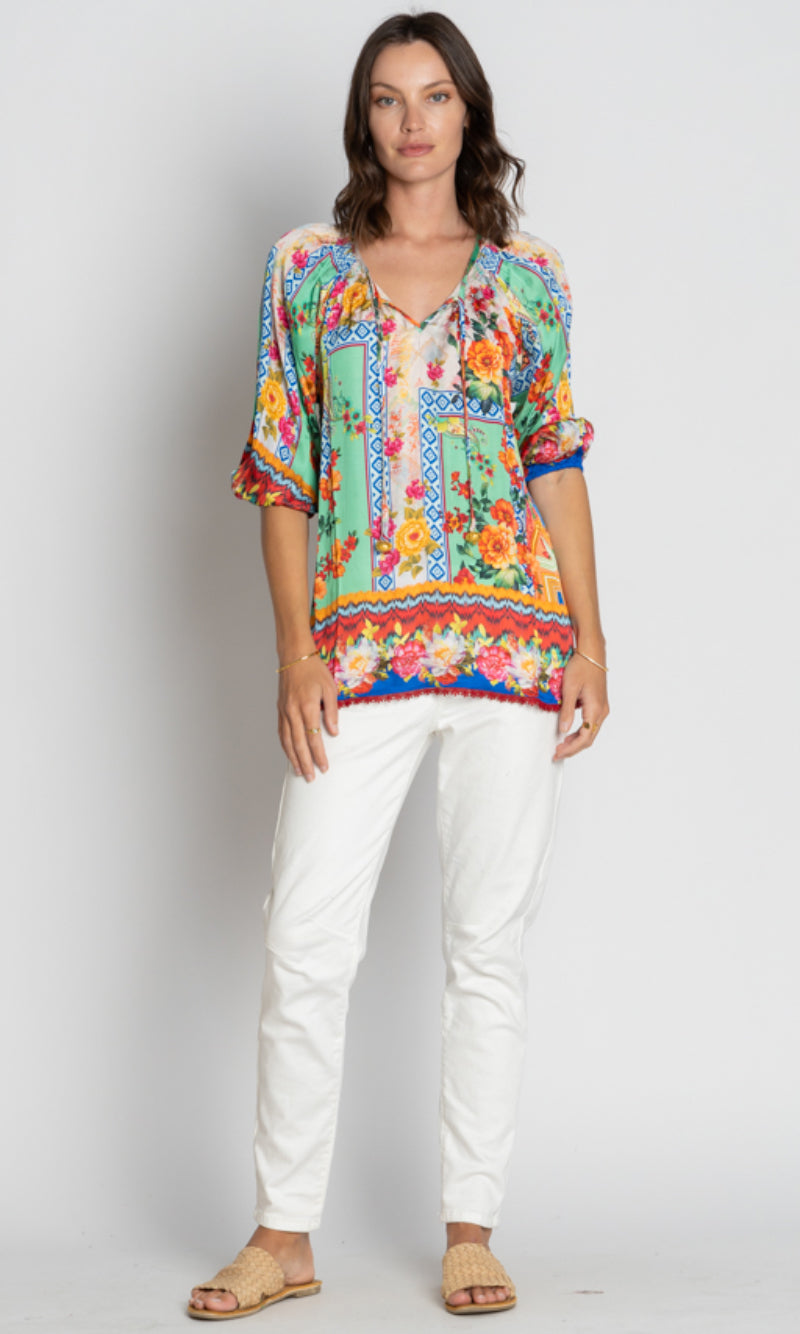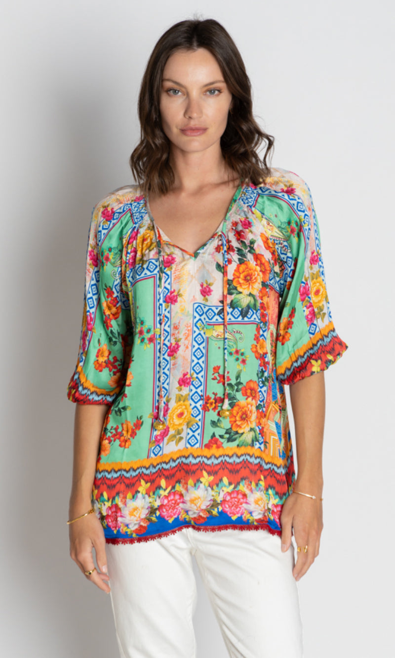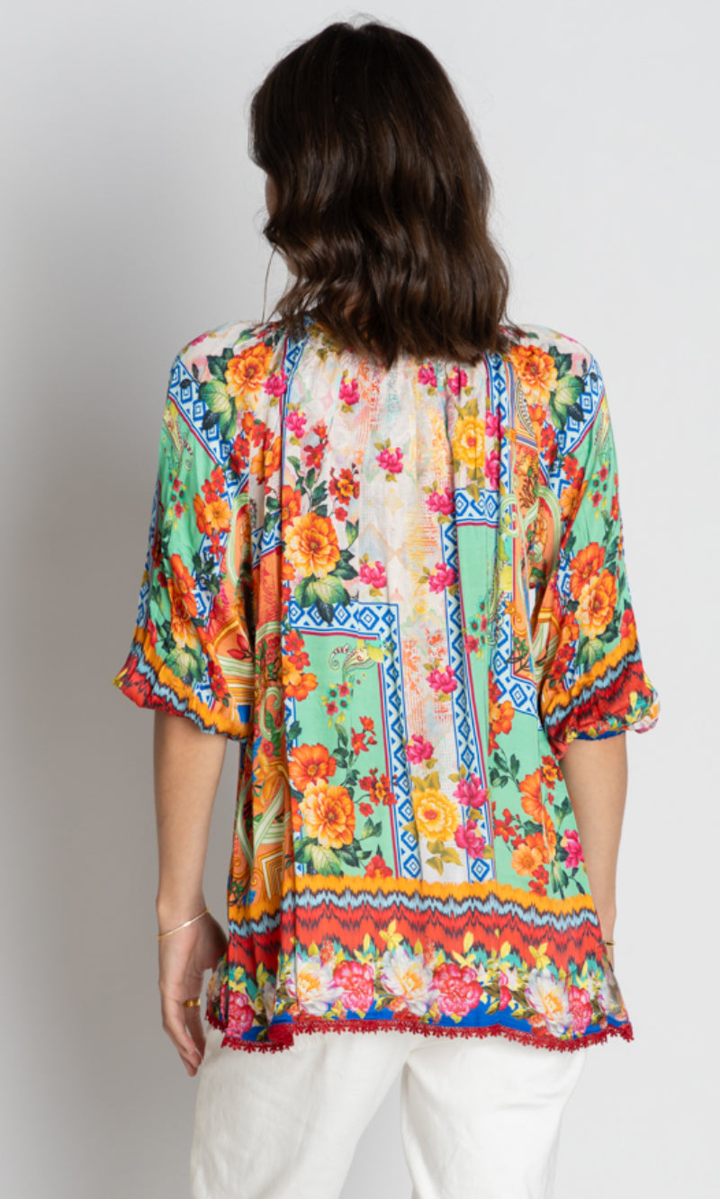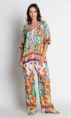 Elevate your everyday style with the LulaSoul Carlisle Top, crafted from 100% satin modal for a luxe feel. Featuring a relaxed fit, scooped neck with ties, 3/4 raglan sleeves with elastic hems, and side splits for ease of movement. Beautiful digital print and braid edging on the hem add a touch of boho elegance. Designed in Australia, this top is perfect for relaxed weekends, resort getaways, or effortless layering.