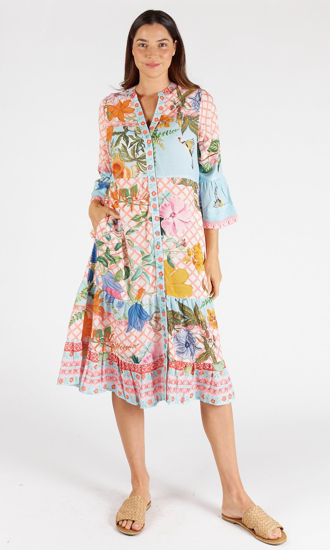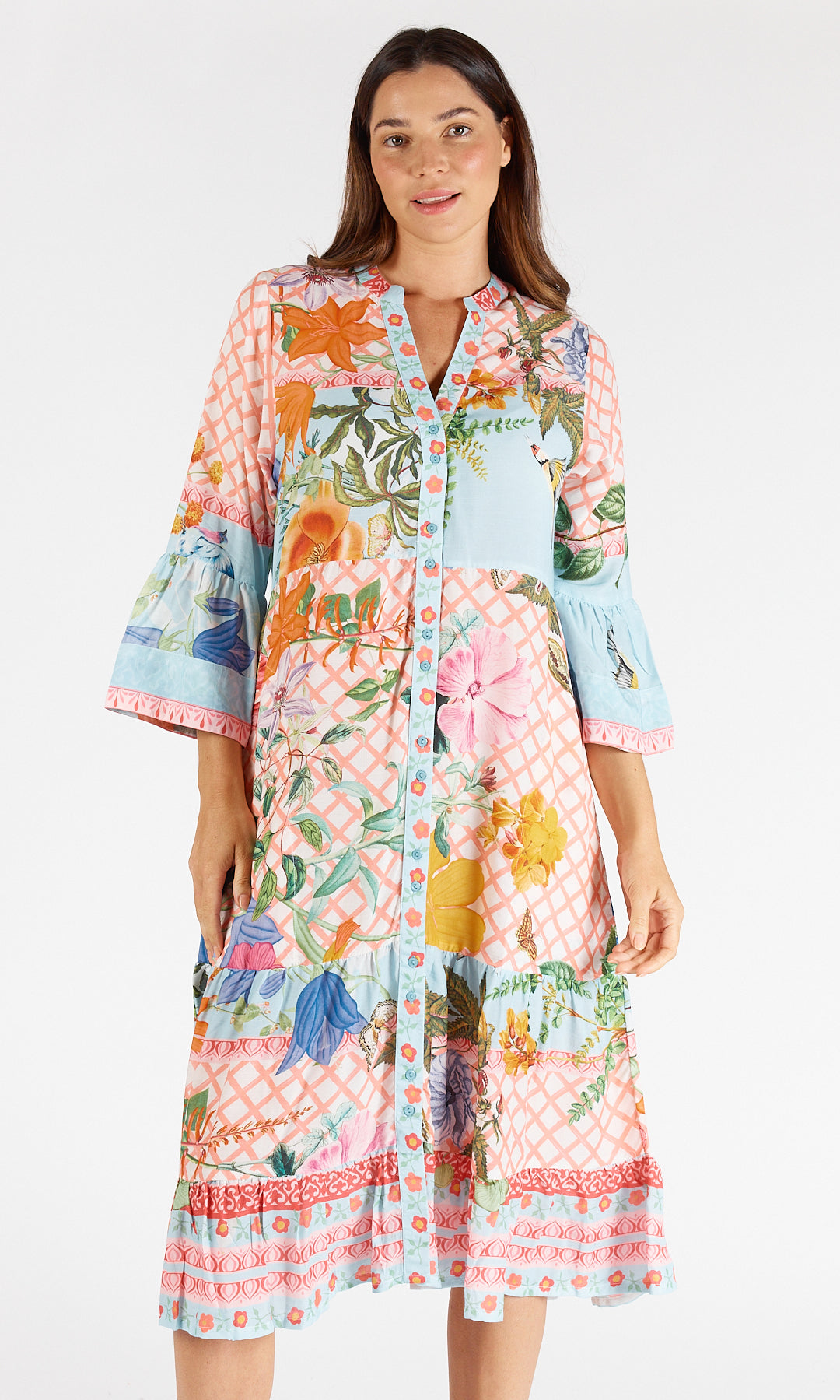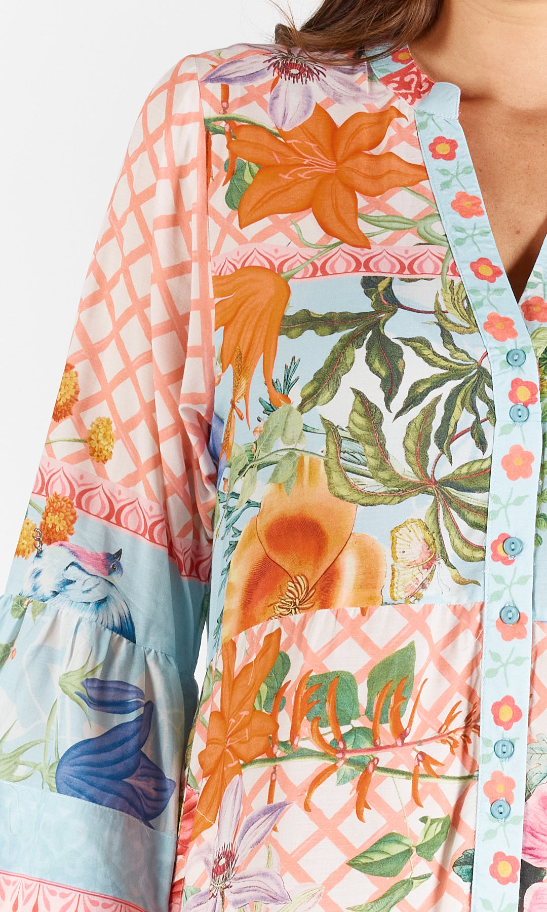 The BELIZE MIDI from Lula Soul is a stunning mist-hued dress with a frill cuff on the sleeves. Its gorgeous print features intricately detailed florals and botanicals, making it the perfect choice for any occasion. Elevate your wardrobe with this exclusive and elegant midi dress.