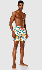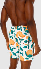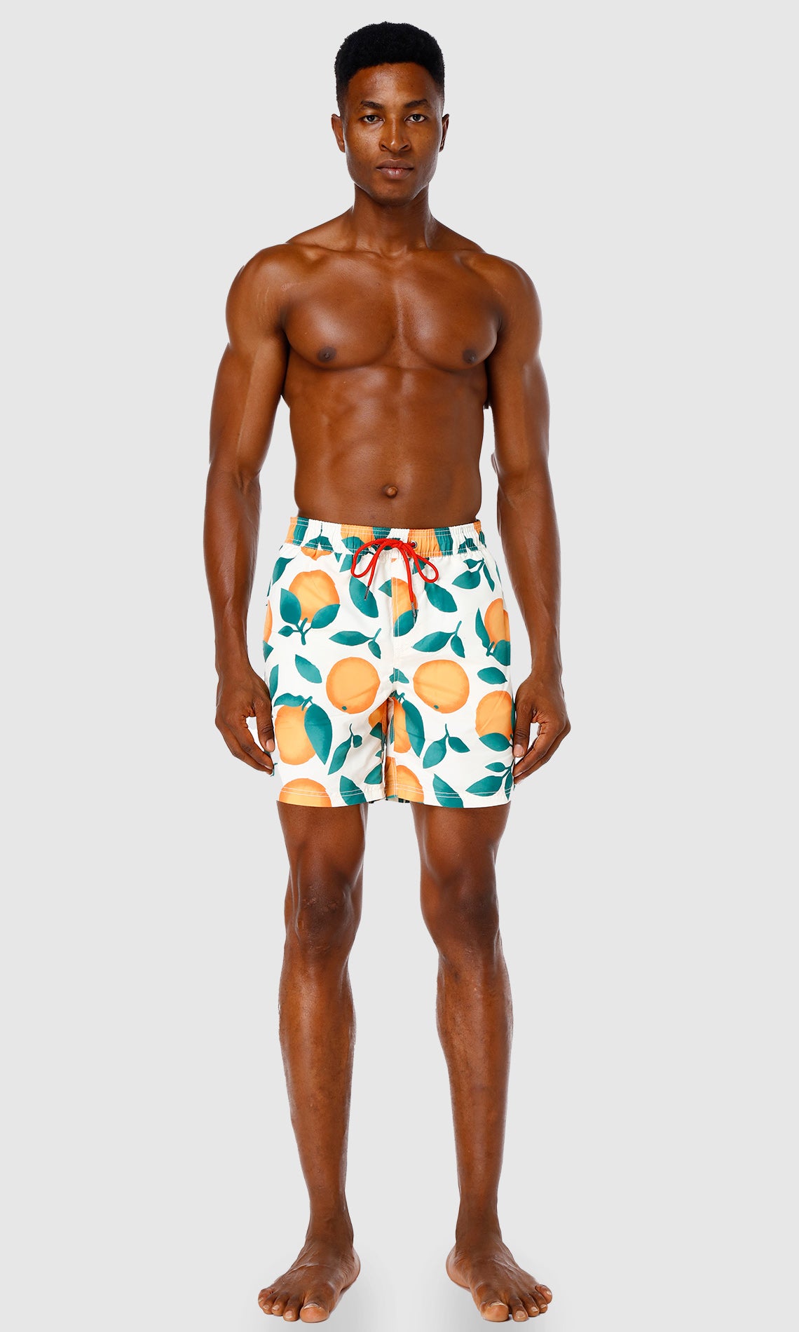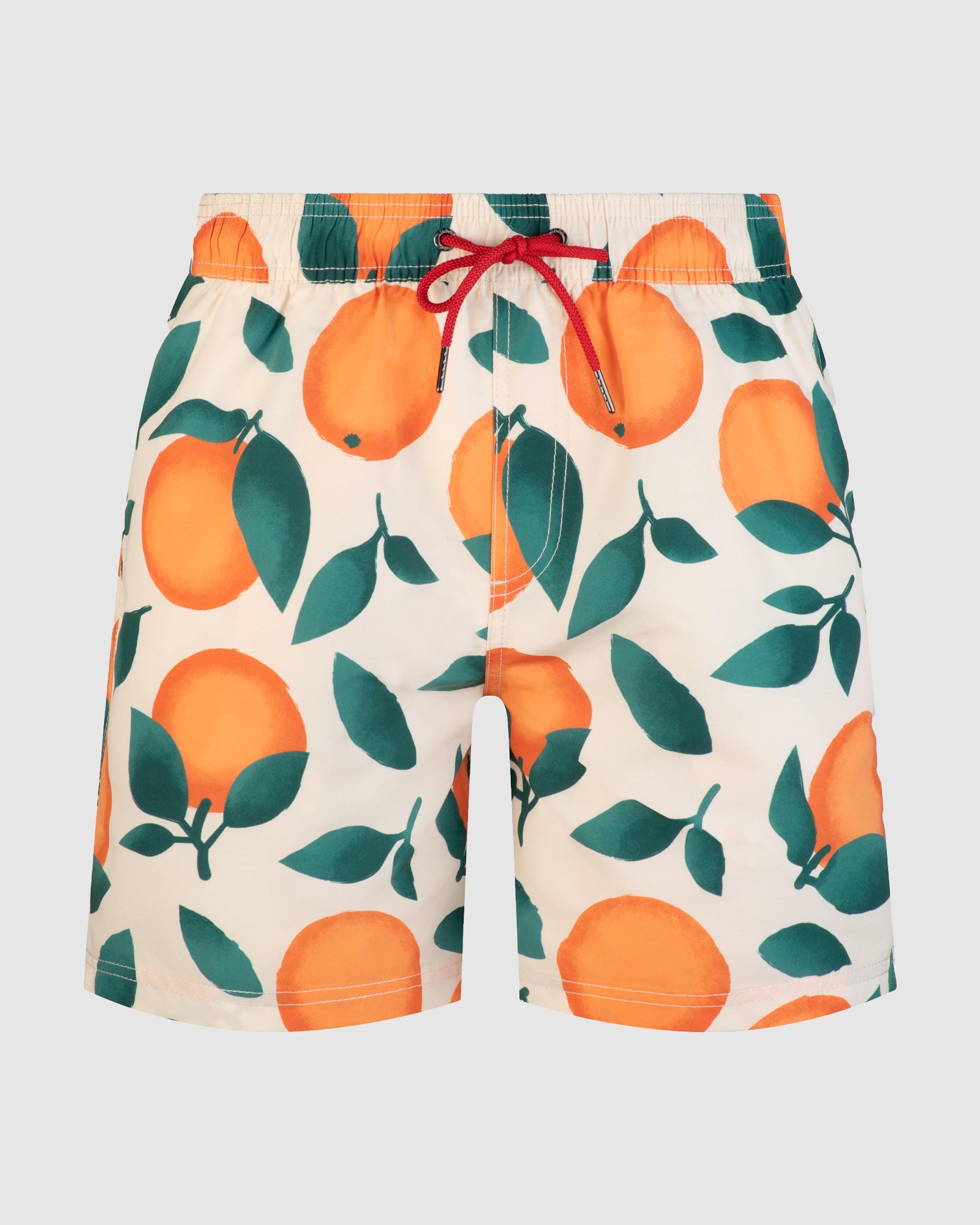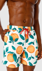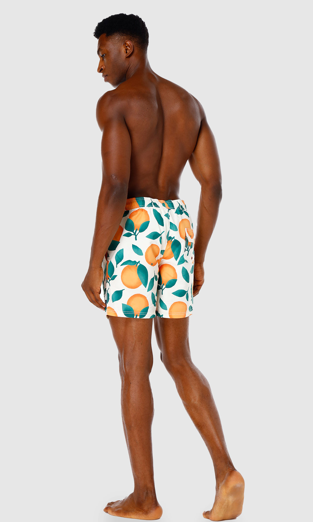 Are you tired of the same old plain swim trunks? Want to add a little something extra to your beach look? Look no further than these fruit-filled Mareeba men's printed Swim Shorts by Coast Clothing. The Oranges & Green Leaf print adds just the right amount of fun without being too over-the-top. Plus, with a cream base, they'll go with just about any colour beach towel or shirt.