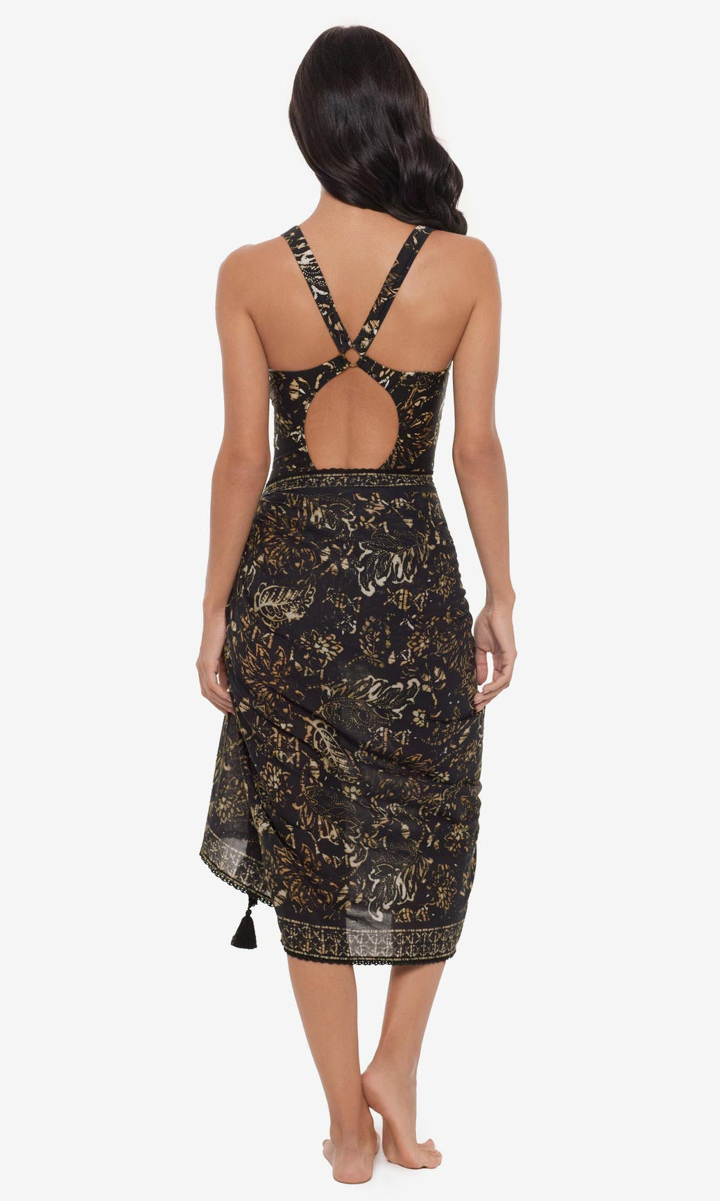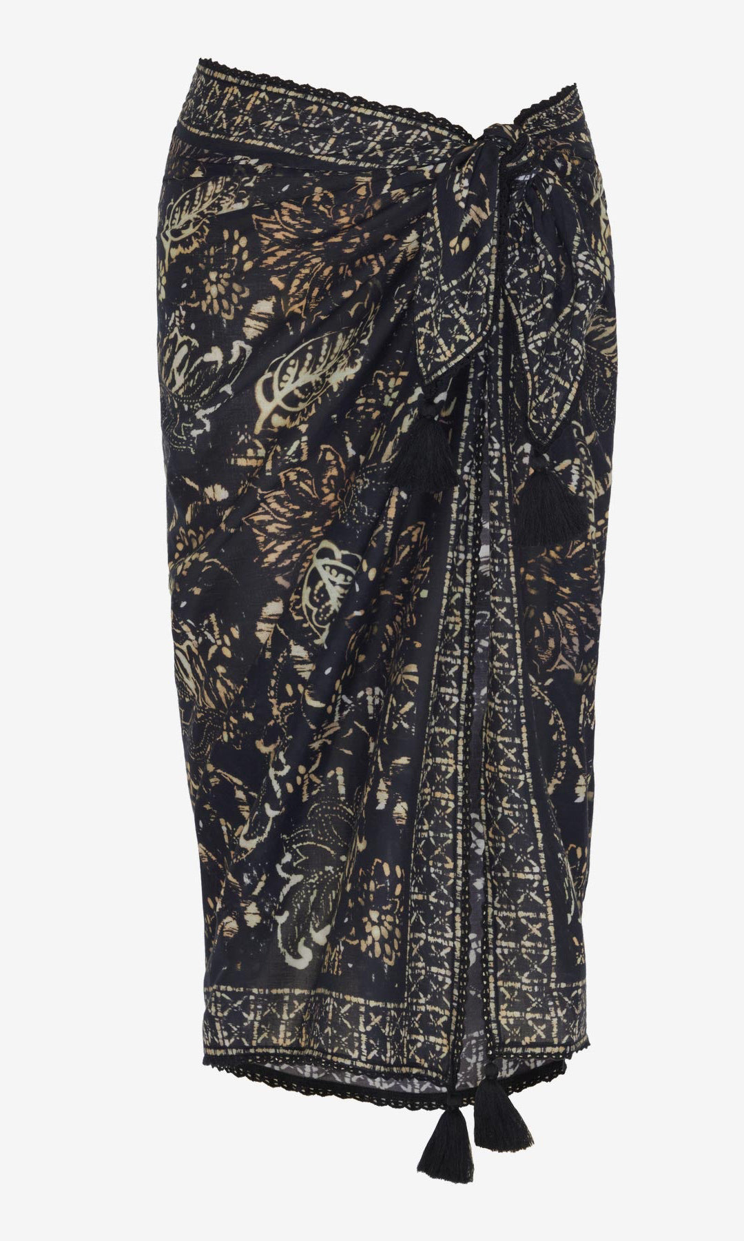 This chic cotton pareo can be worn as a skirt or a dress. A crocheted trim and playful tassels add just enough flair.