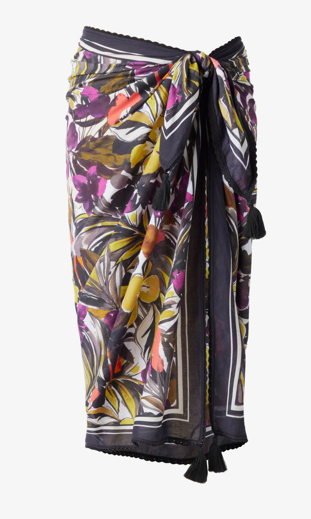 This full coverage pareo can be worn as a skirt or a dress. A crocheted trim and playful tassels add just enough flair.
