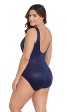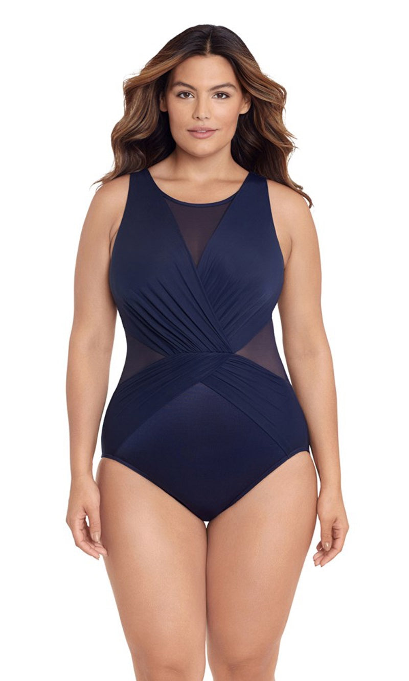 Cut a sleek figure on the beach in this one-piece swimsuit with high neck coverage and built-in shaping. Miraclesuit's powerful Miratex fabric provides all-over body control for a smoother look, while clever waistline gathering and triangular mesh panels create an instant hourglass silhouette. Choose this slimming bathing suit when you want wirefree comfort, flattering figure-control, and maximum coverage at the neckline.