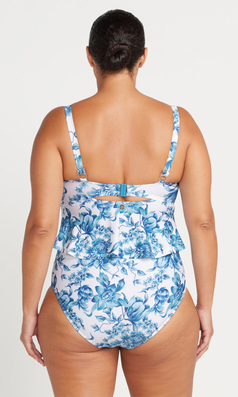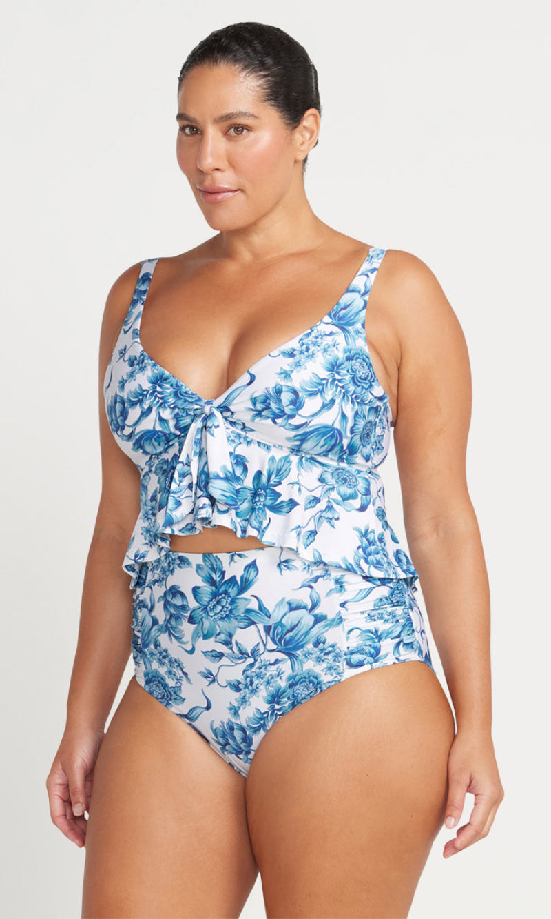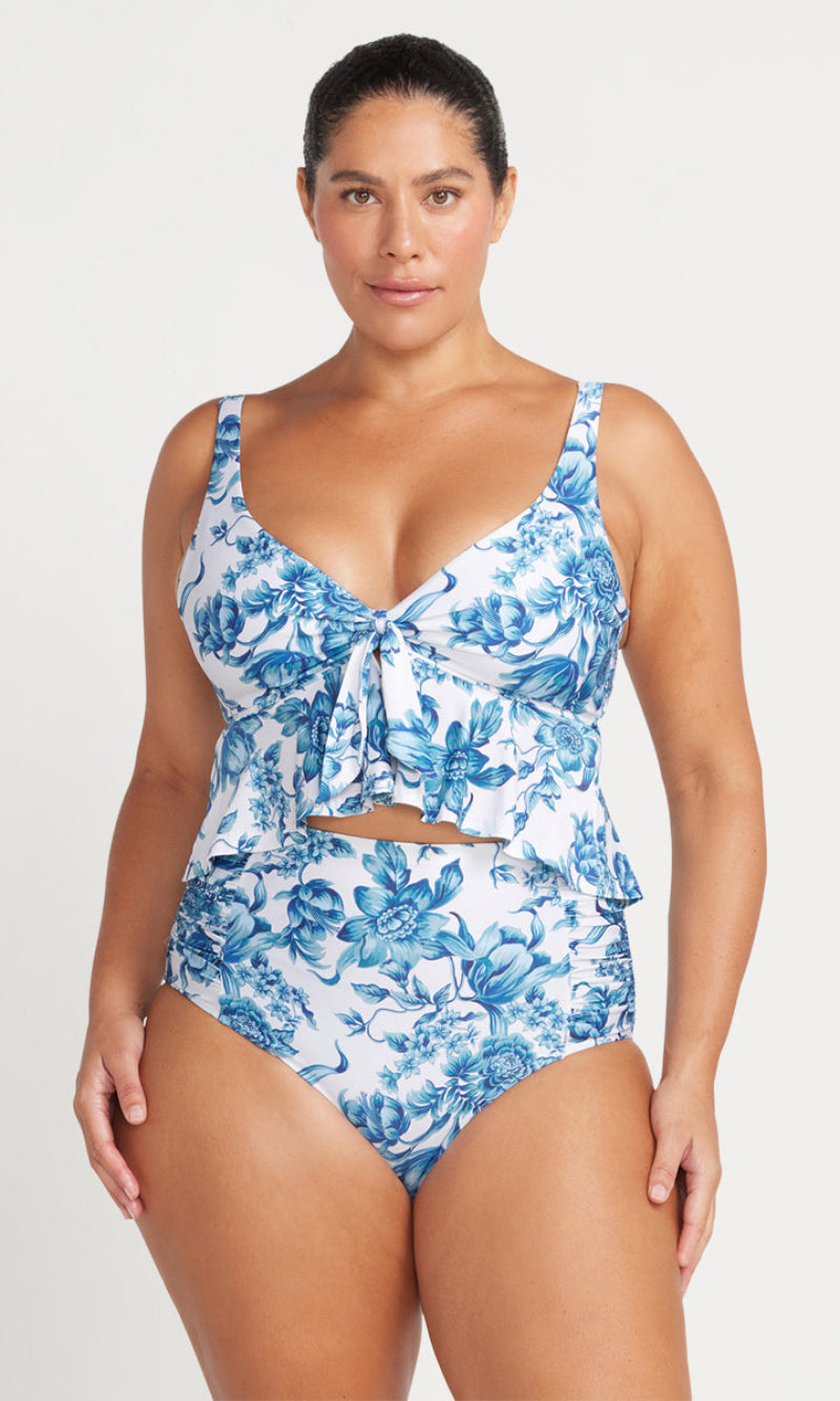 Artesands fits your curves. Our Chagall curve fit and plus size soft cup bikini top has been designed for a smaller cup size and looks amazing on an A cup, B cup, C cup and D cup, this has removable multifit cups. Our Chagall midriff bikini top we say has fashion and form with a faux knot tie front, a small peephole and a cute flounce with just a little bit more coverage. Chagall has wide adjustable straps for extra comfort and support and a back clip is for strength.
