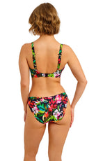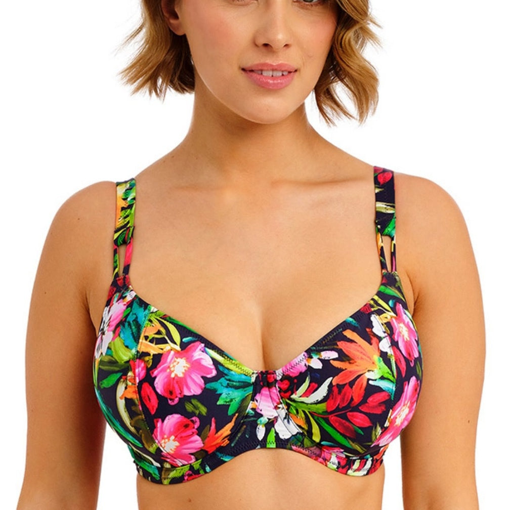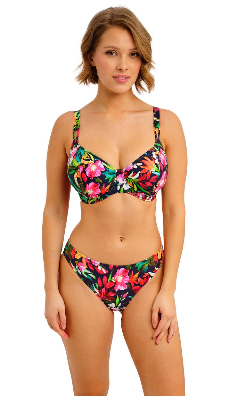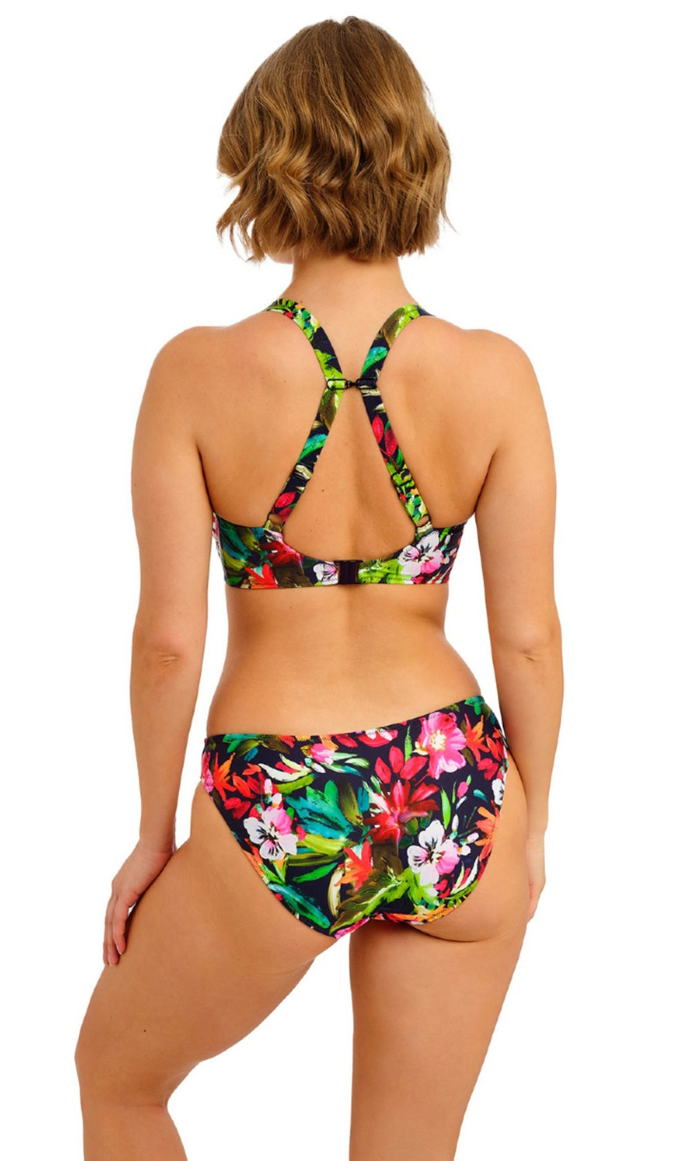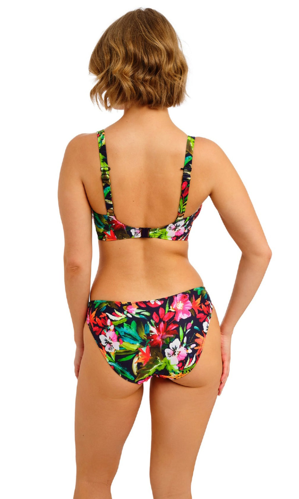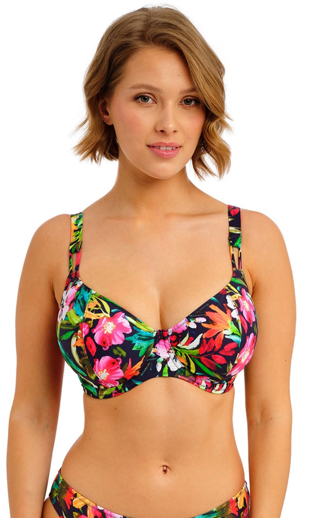 Hit the waves in style with Kailua Shores, our new hot tropical print, designed to make a bold statement. Fusing this season’s key colours of hot pinks, fiery oranges, and luscious jades across a dark navy ground, select styles are accented with gold coloured leaf trims. Kailua Shores is the perfect collection for lounging by the pool or hitting the beach, especially in our new reduced coverage UW Plunge Bikini Top - perfect for tanning!