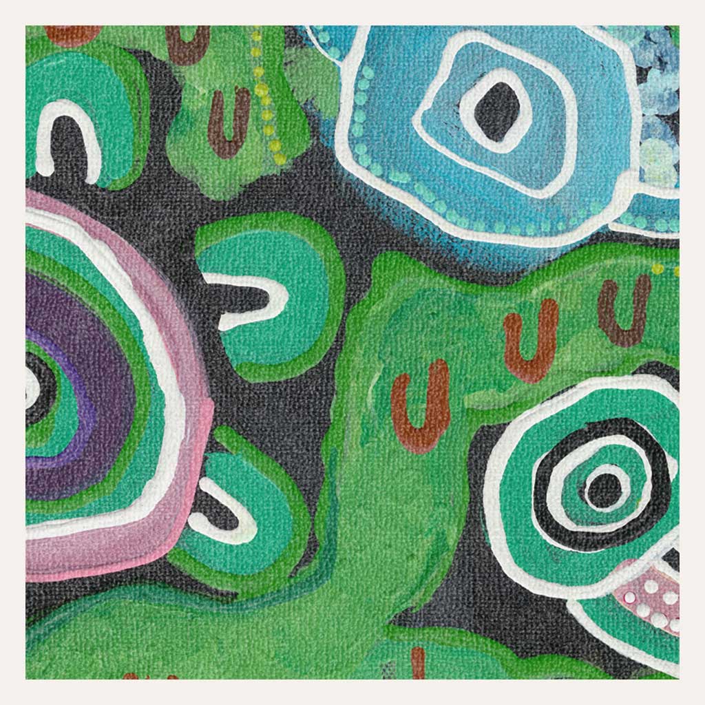 Her paintings are inspired by her connections to Wiradjuri Country.