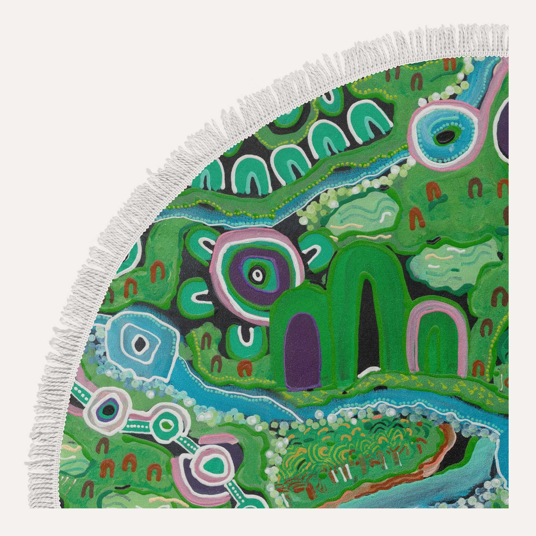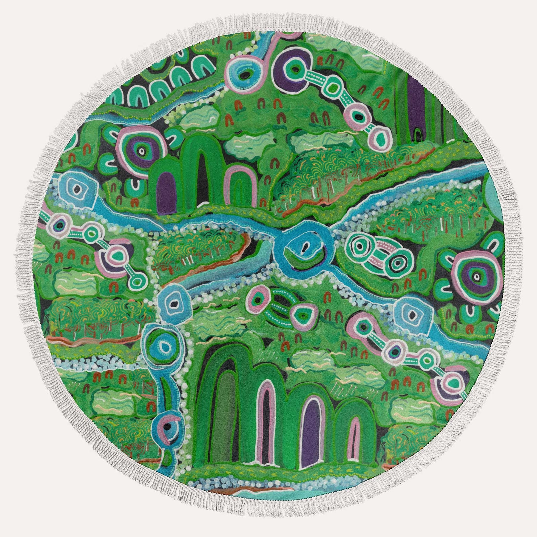 Ethically crafted, dye-sub printed towel made with 100% microfibre soft terry fabric and white twist fringing.