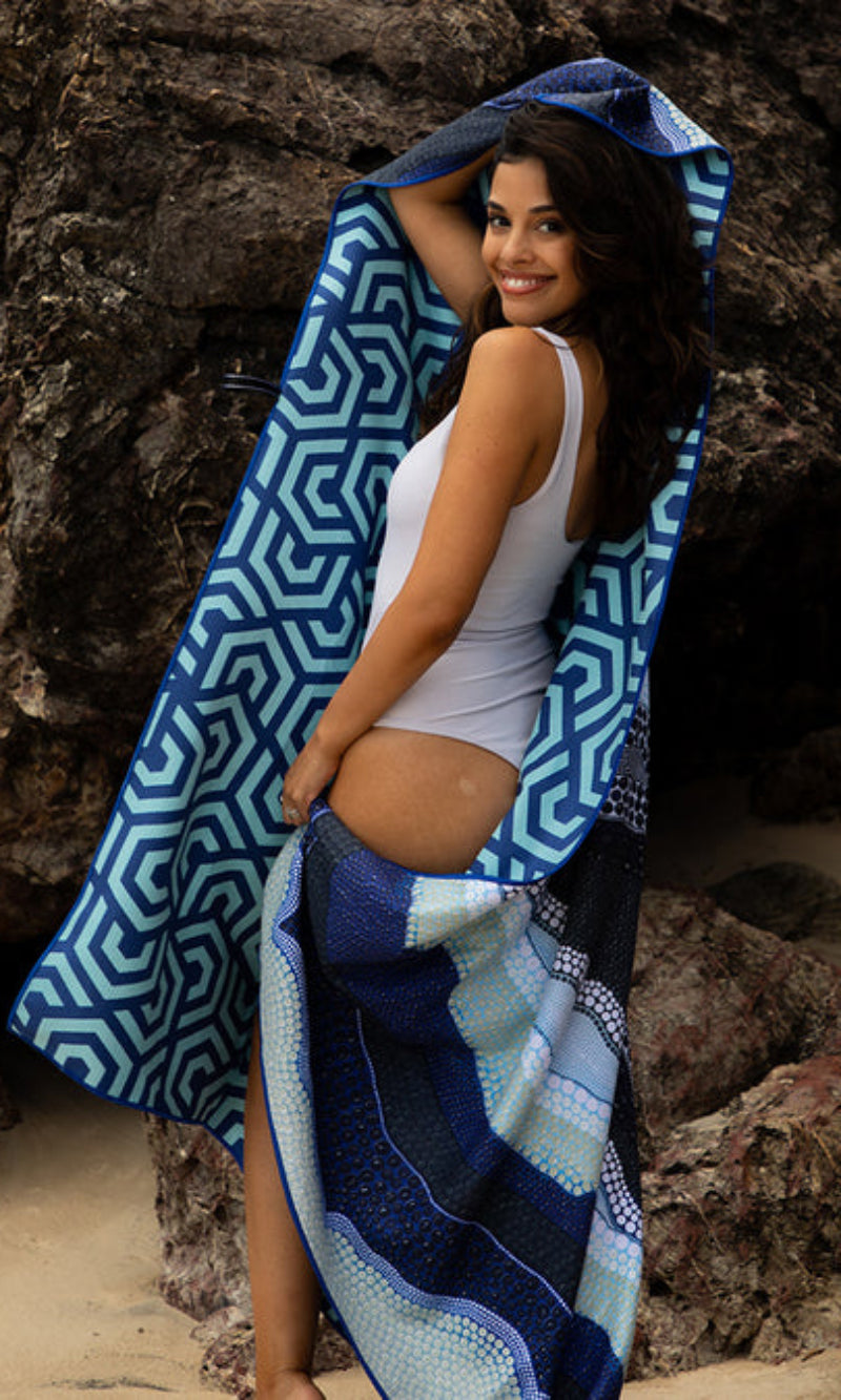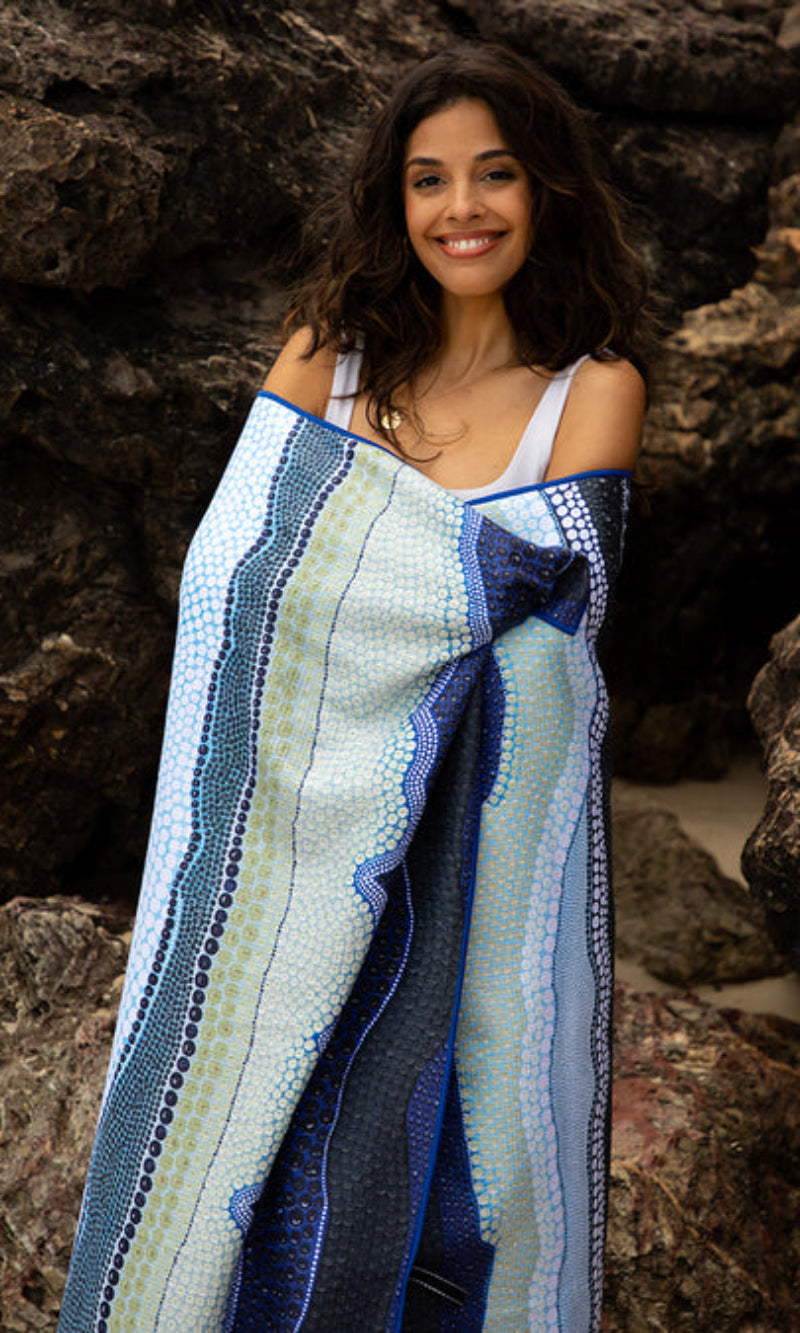 Elevate your next beach trip with our luxurious sand-free beach towels, showcasing stunning artwork by First Nations collaborating artists. Each towel features a beautiful, sublimated design that tells a unique story of the artist's deep connection to Country.