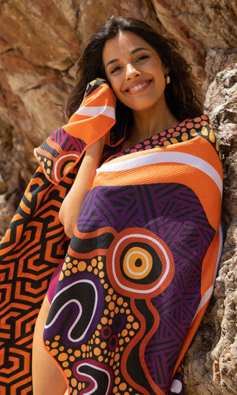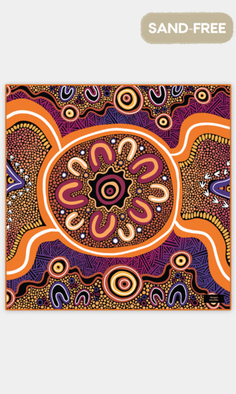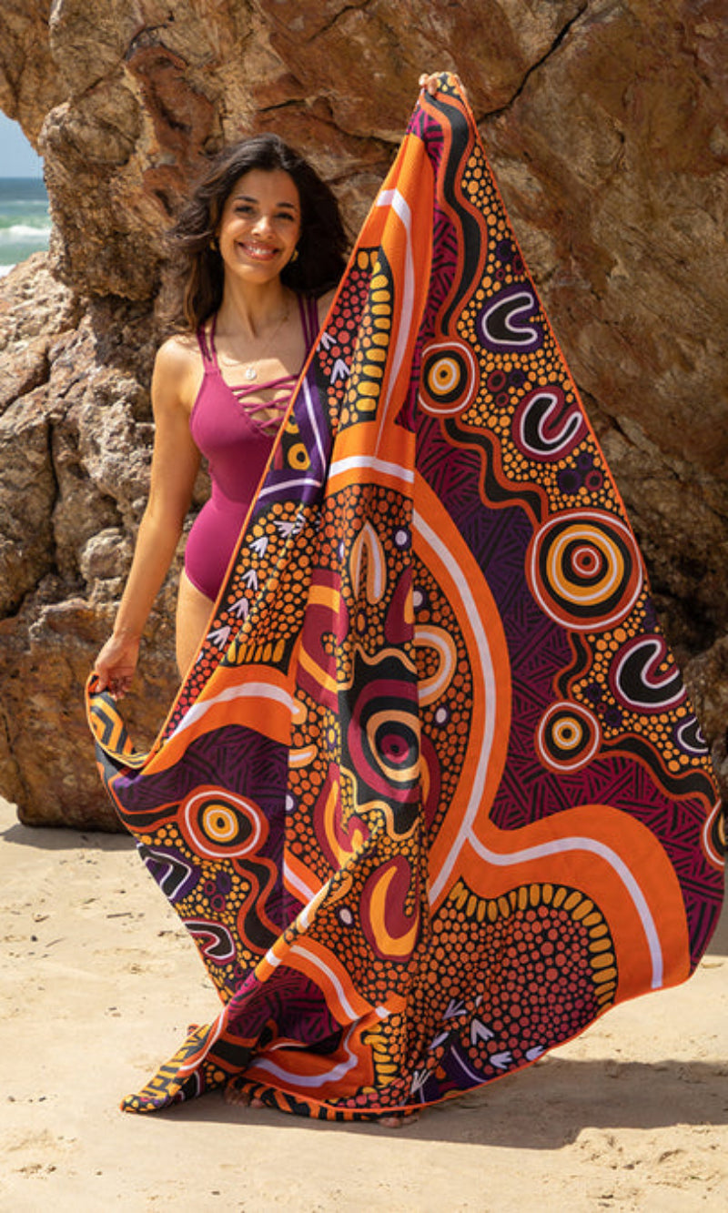 Elevate your next beach trip with our luxurious sand-free beach towels, showcasing stunning artwork by First Nations collaborating artists. Each towel features a beautiful, sublimated design that tells a unique story of the artist's deep connection to Country.