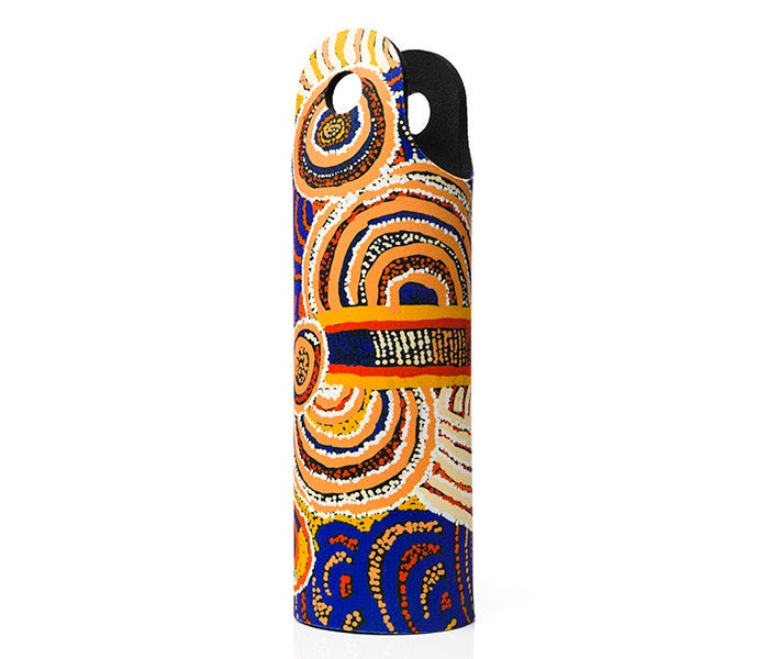 Keep your water bottle close and cool with these great neoprene water bottle carriers. Made in Australia, bottle carriers feature artwork by Nora Davidson from Papulankutja Artists located at Blackstone, Western Australia. Includes a strap so you can carry on the go!