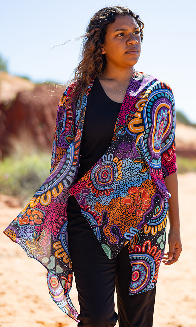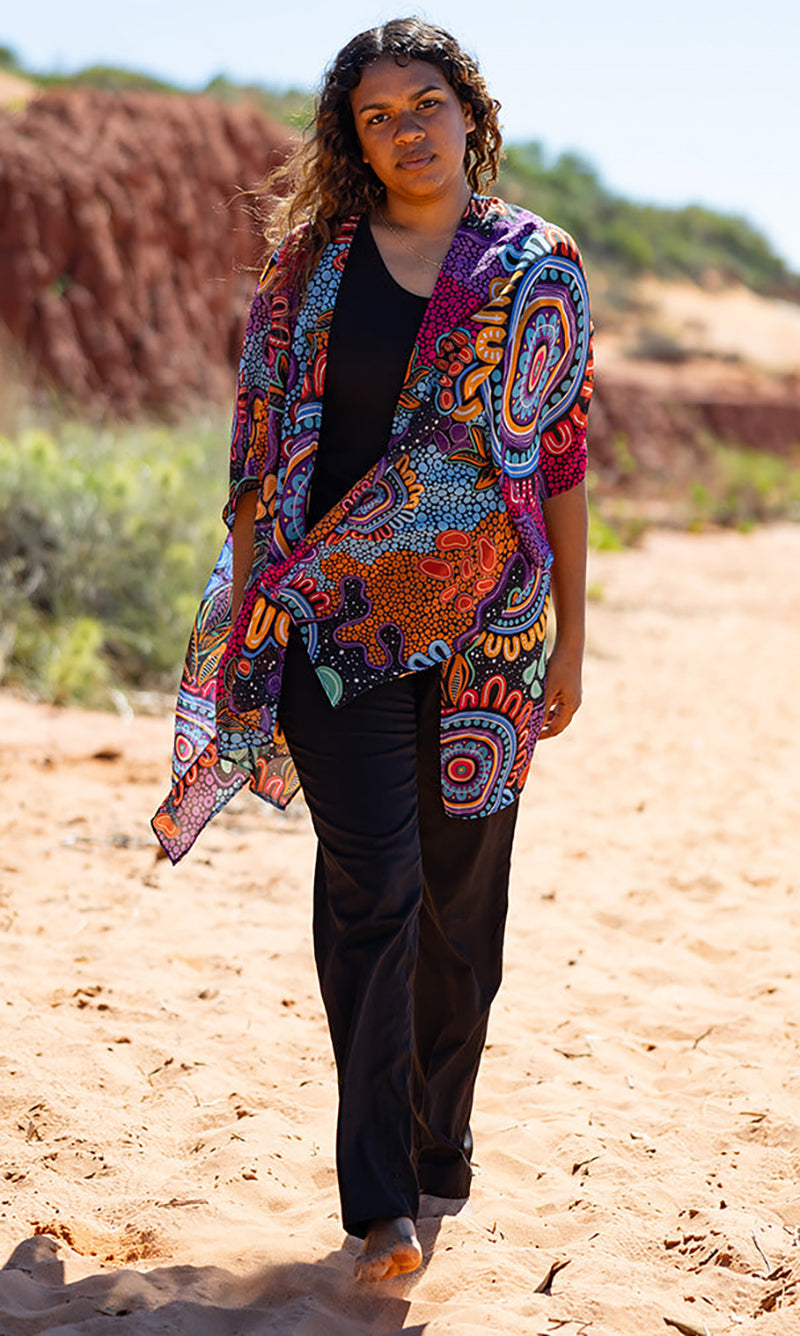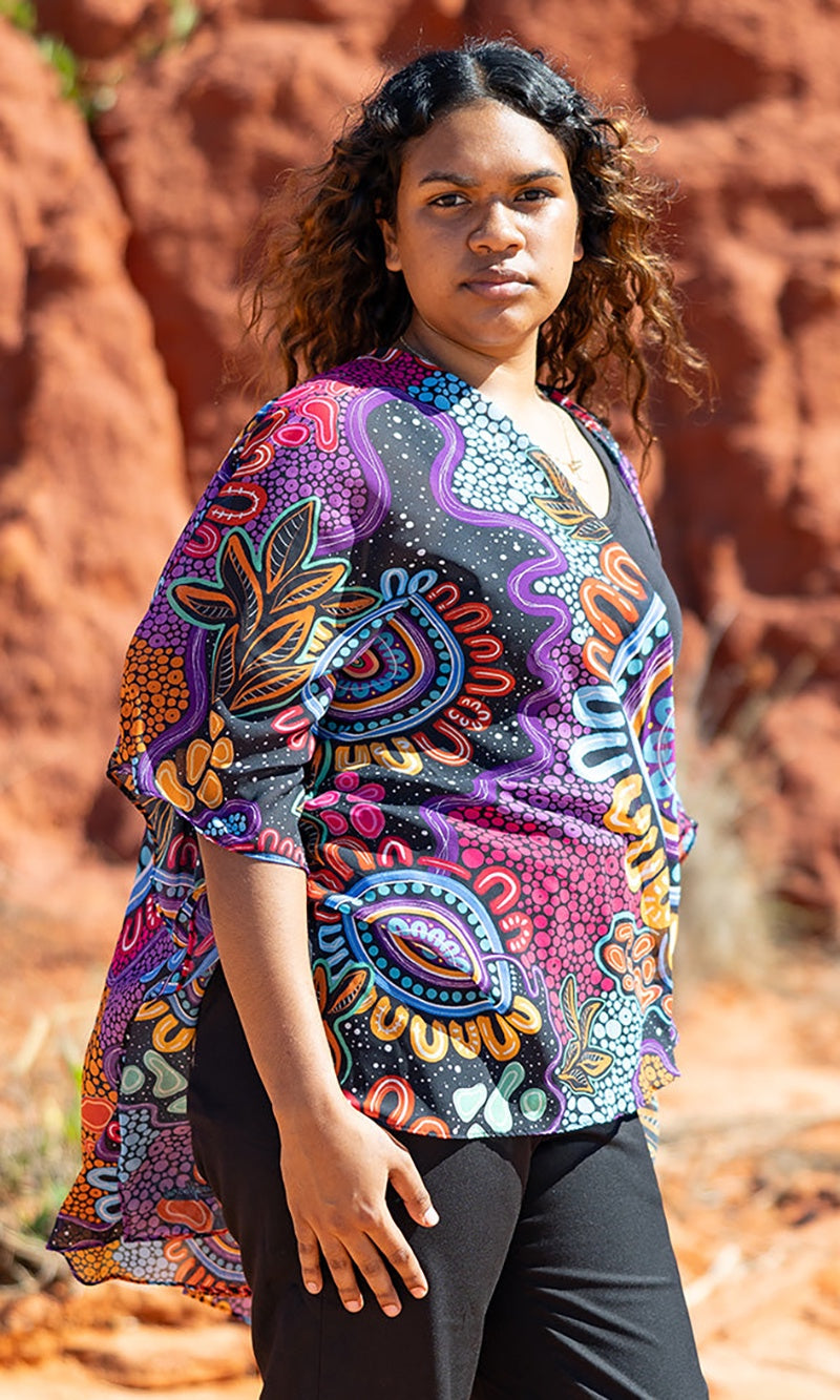 "This design represents people from all nations coming together to celebrate our beautiful cultures. With all our Elders surrounded watching the next generation grow with strong identities while they practice culture, dance, language, art and story telling." -Alkina
