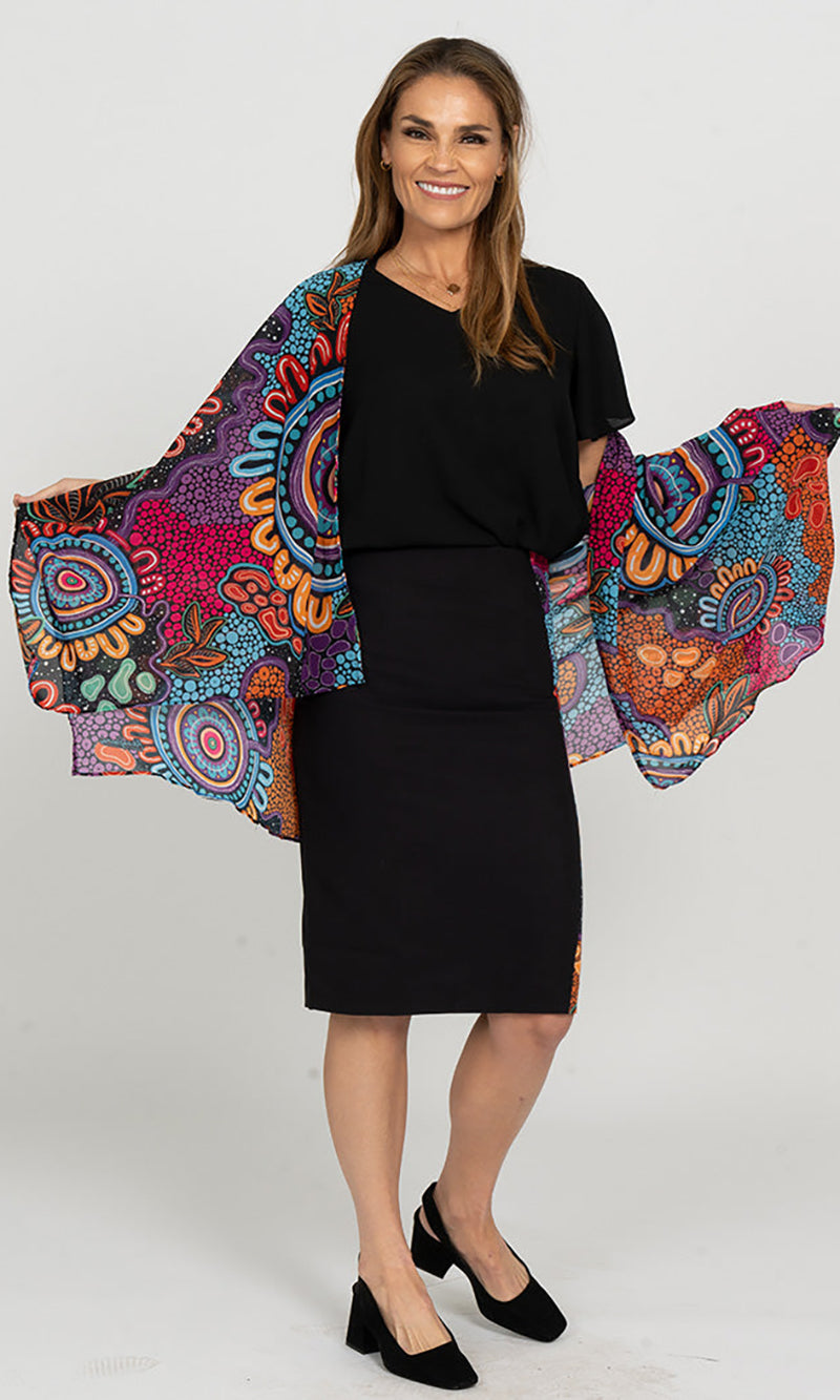 Available in a generous single size, our shawls are tailored with arm holes for the perfect fit. They are made from soft, flowing chiffon that holds colour beautifully. A lightweight and breathable piece that works in all seasons.