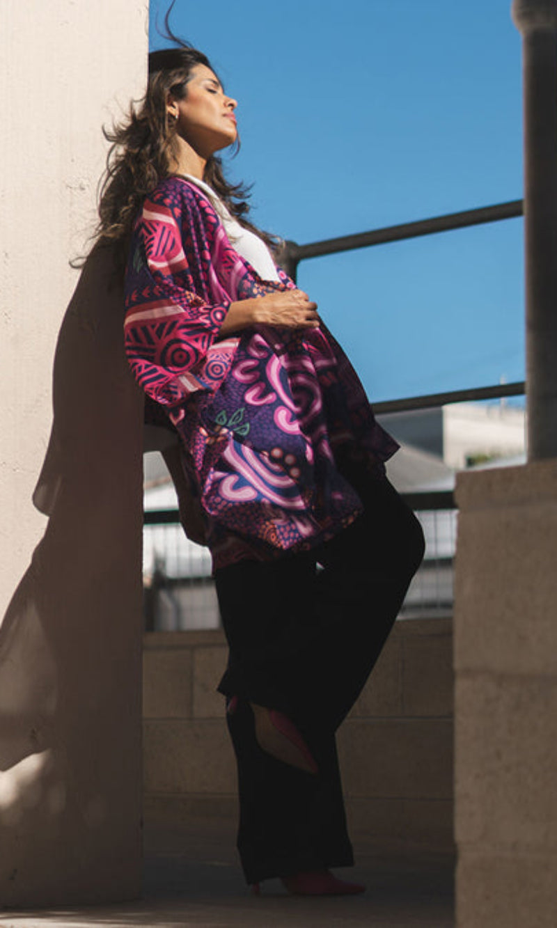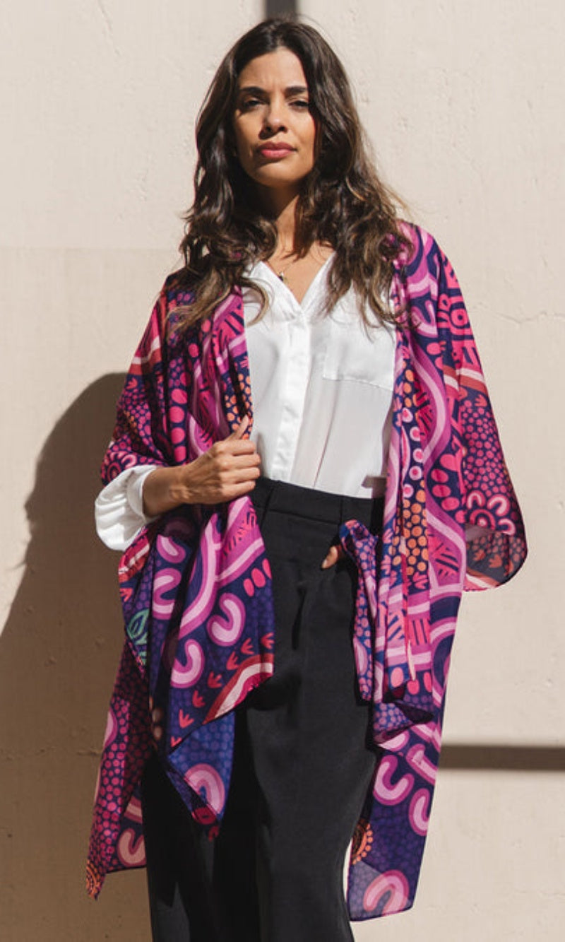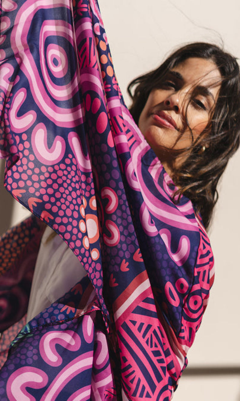 Wiradjuri artist Amy Kilby created these pieces as a heartfelt celebration of the strength, unity, and resilience of women within their communities. Now available across a full fashion and accessories range, her artworks come to life through flowing dresses, statement skirts, and elevated everyday staples - designed to move with you and empower you. These pieces offer more than just style; they carry story and meaning, inviting you to feel the power and harmony woven into every thread.