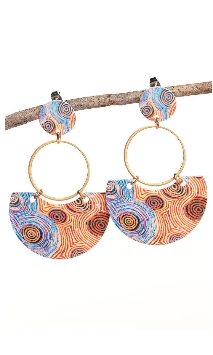 These sheek statement earrings are the perfect way to bring some fun and colour to your corporate look. They feature gold accents and lightweight metal pieces printed with the artwork Mina Jukurrpa by Indigenous artist Pauline Napangardi Gallagher.