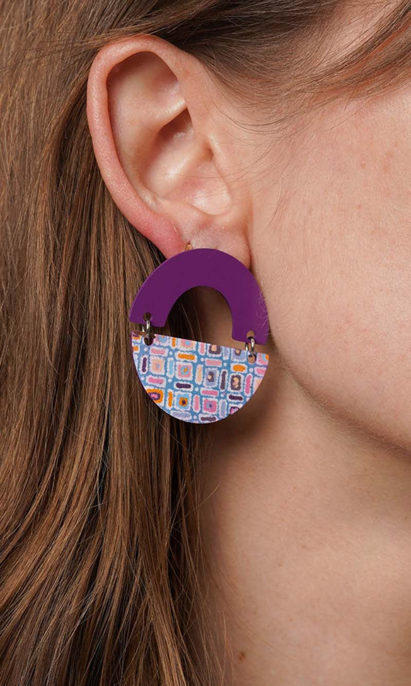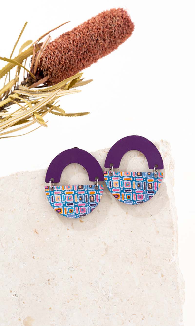 These statement earrings are perfect for adding eye-catching colour and pattern to simple outfits. Try pairing with a simple shift dress and sandals in the summer, or a culottes, ankle boots and turtleneck sweater for a trendy winter look. They are composed of lightweight PU set in rhodium plated alloy printed with the artwork ‘Ngapa’ by Indigenous artist Lynette Nangala Singleton.