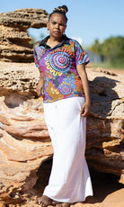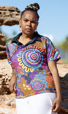 "This design represents people from all nations coming together to celebrate our beautiful cultures. With all our Elders surrounded watching the next generation grow with strong identities while they practice culture, dance, language, art and story telling." -Alkina