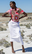 This artwork was originally created in response to the theme of Keep the Fire Burning! Blak, Loud and Proud and is appropriate for anyone to wear. The artist's unique vision is a testament to the diversity of ways we celebrate Culture, Identity and Knowledge.