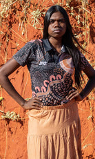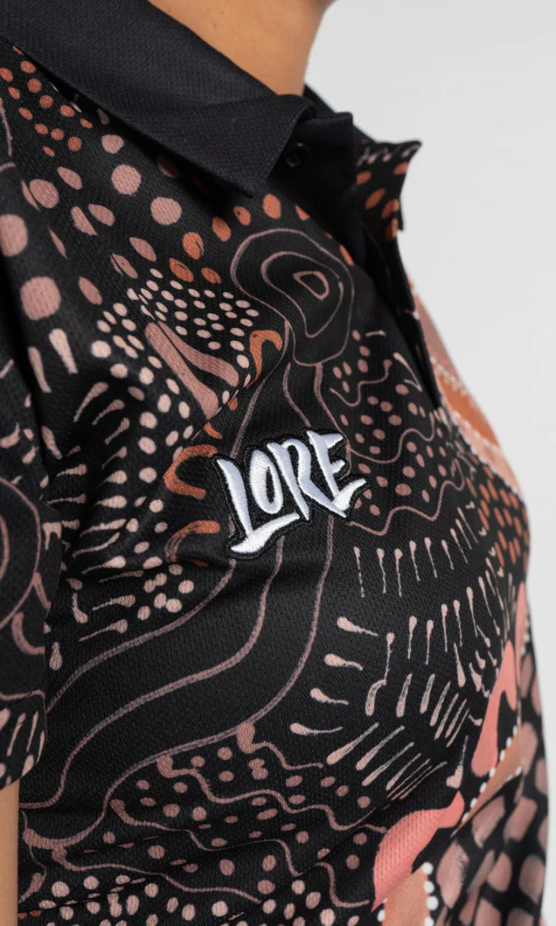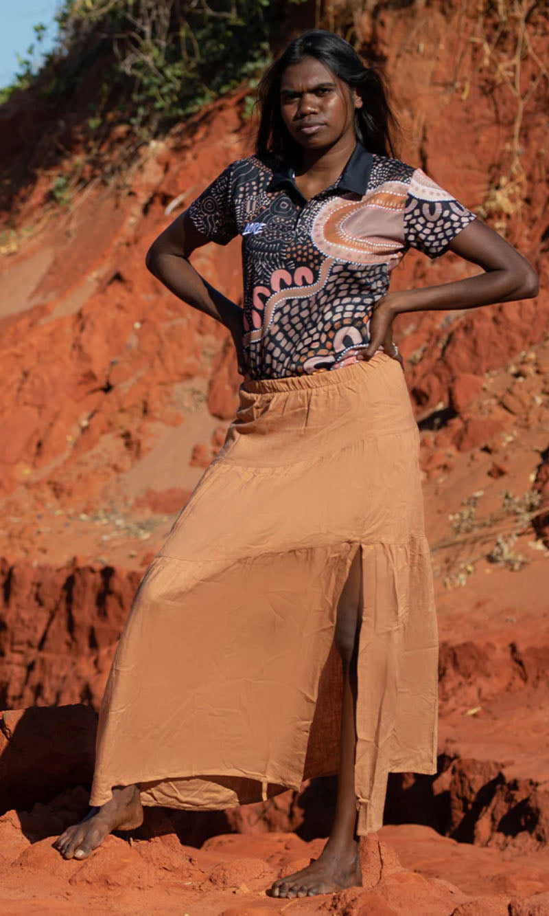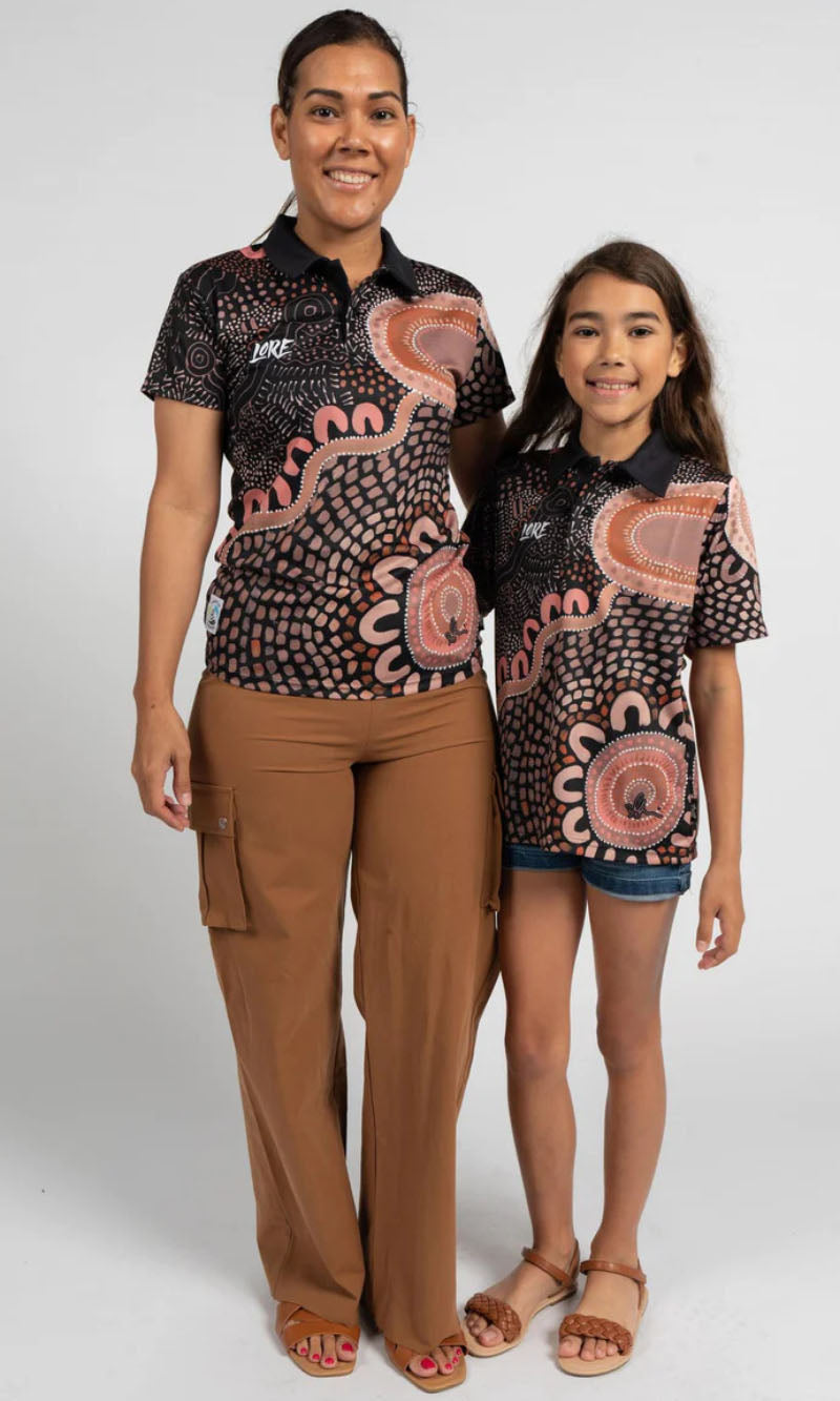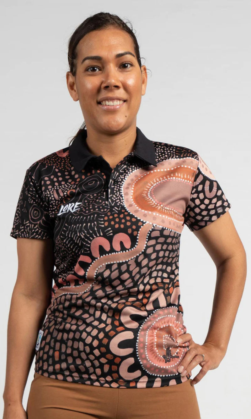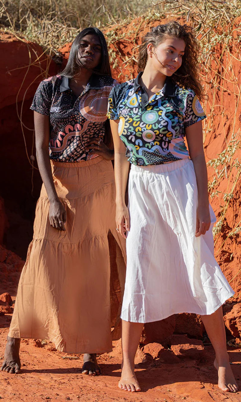 Look great and stay sun safe with our fitted polo shirt crafted from recycled polyester. Our polos deliver a comfortable, stylish look that can be worn anywhere, a true wardrobe essential. This women’s polo shirt features ‘Gathering on Country’, a gorgeous artwork by Barkindji Woman Caitlyn Davies-Plummer.