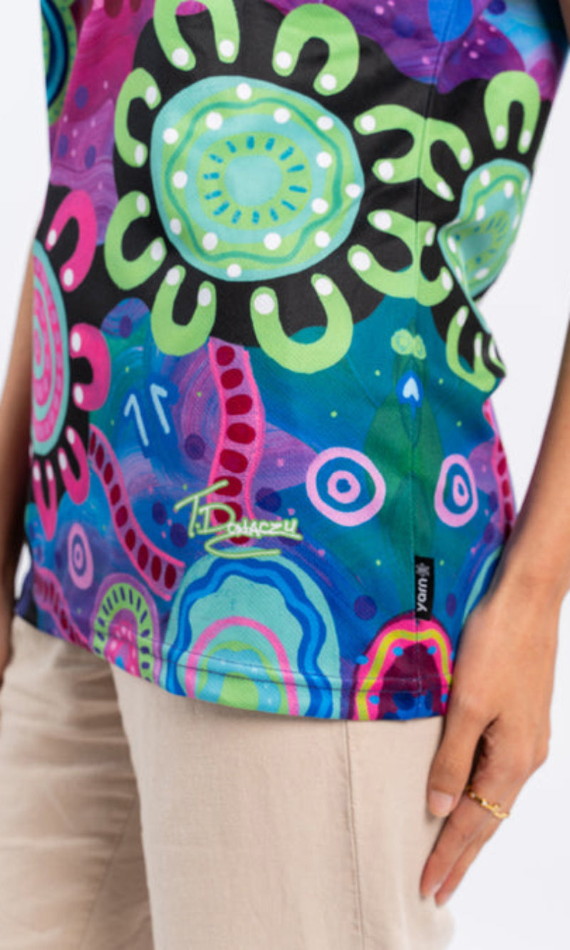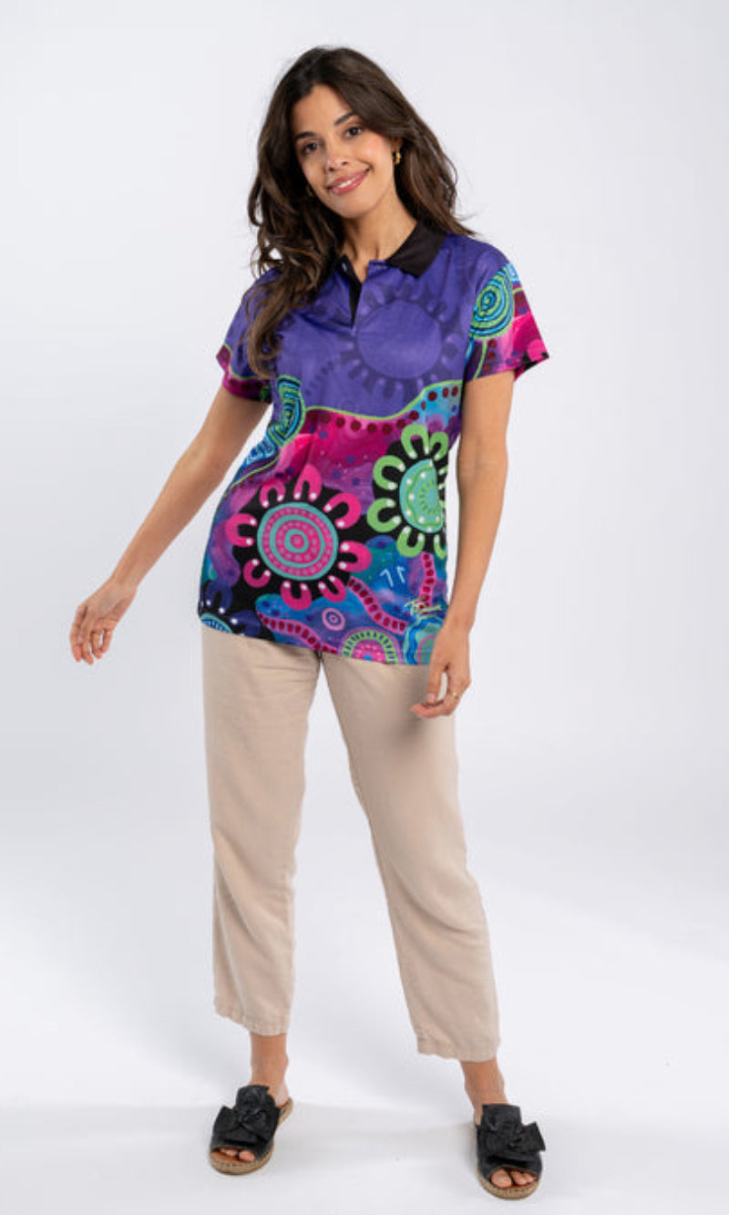 With built-in UPF50+ sun protection, you can enjoy the outdoors with confidence, knowing your skin is shielded from harsh UV rays. Available in unisex and fitted sizes, this polo is more than just everyday wear - it’s a vibrant celebration of First Nations culture, designed to be seen and appreciated wherever you go.