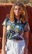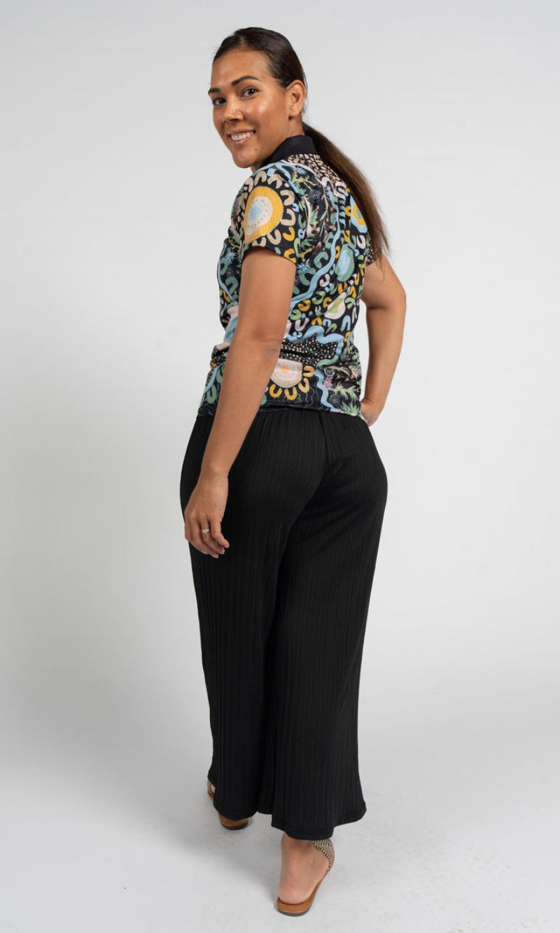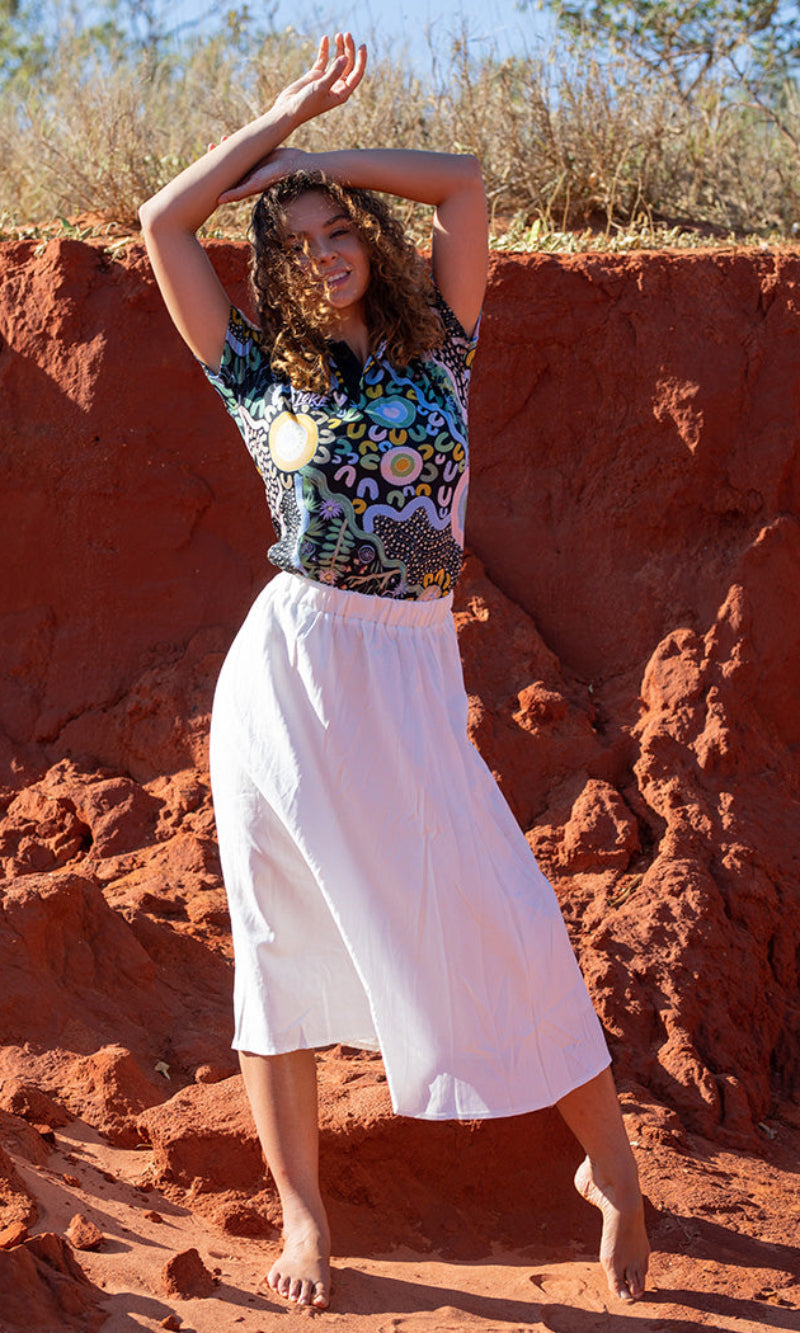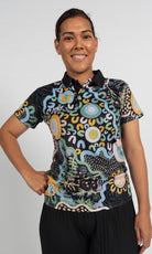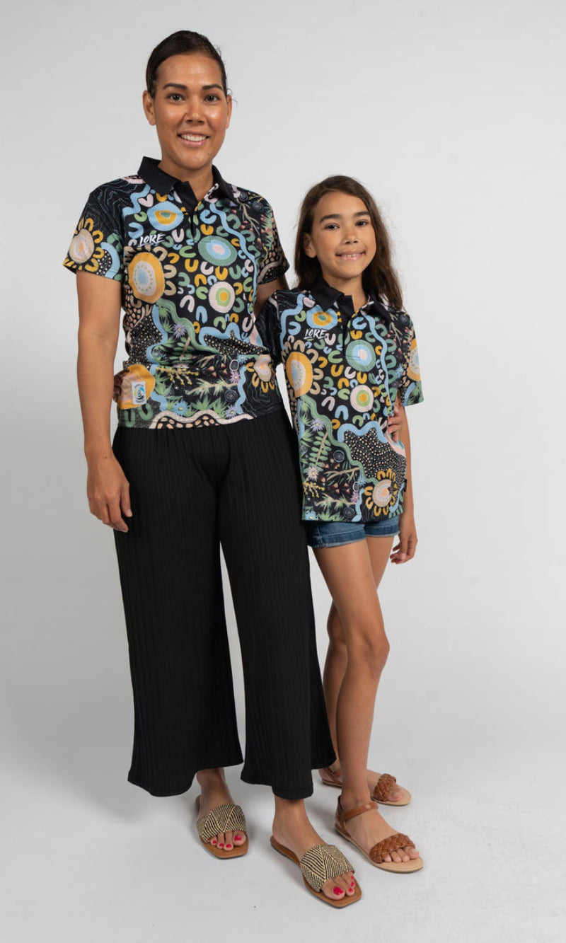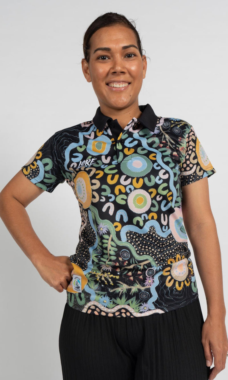 Look great and stay sun safe with our fitted polo shirt crafted from recycled polyester. Our polos deliver a comfortable, stylish look that can be worn anywhere, a true wardrobe essential. This women’s polo shirt features ‘Two Worlds’, a gorgeous artwork by Barkindji Woman Caitlyn Davies-Plummer.