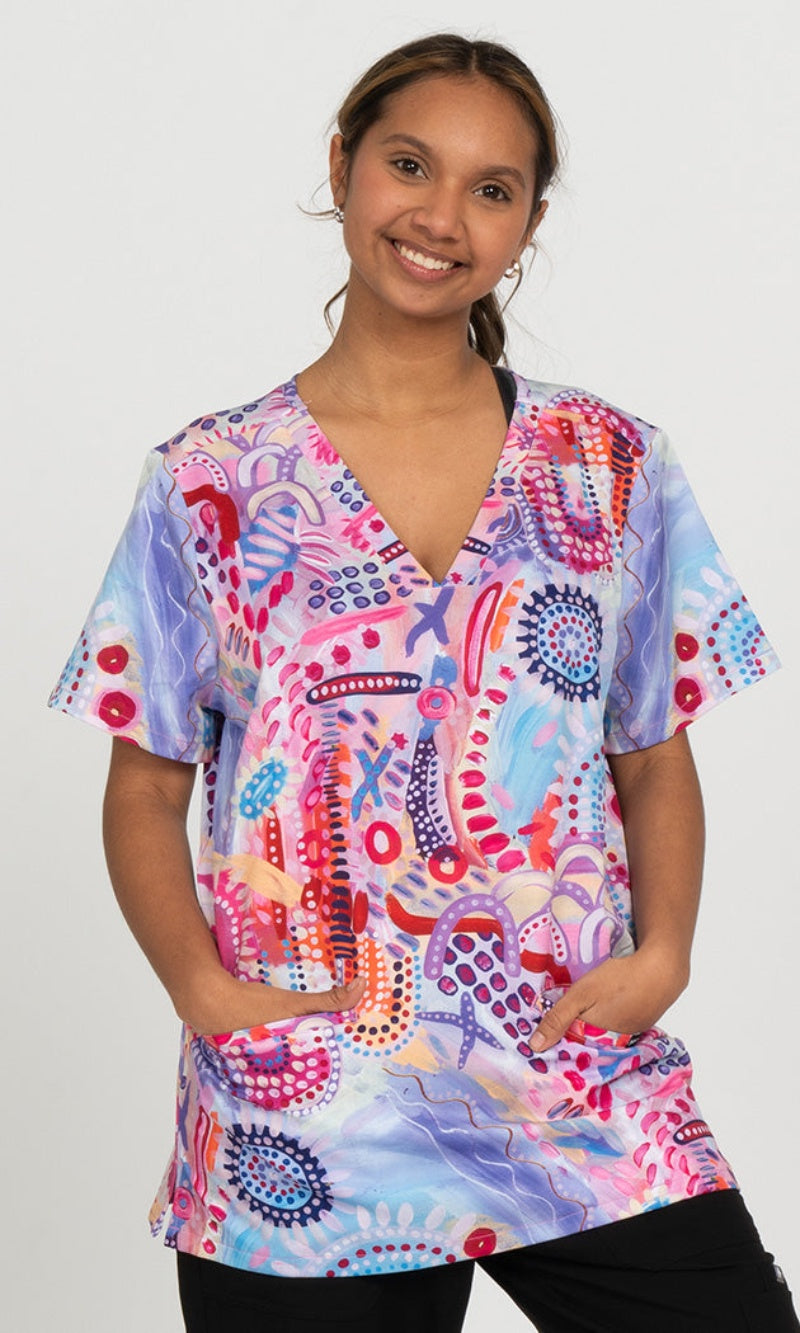 Brighten up long days on your feet caring for those who need it most! Our scrubs feature First Nations artwork printed onto excellent quality workwear that is both practical and beautiful.