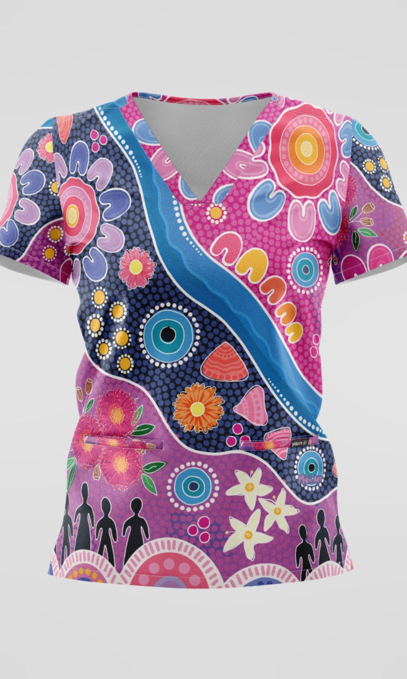 Brighten up long days on your feet caring for those who need it most! Our scrubs feature First Nations artwork printed onto excellent quality workwear that is both practical and beautiful.