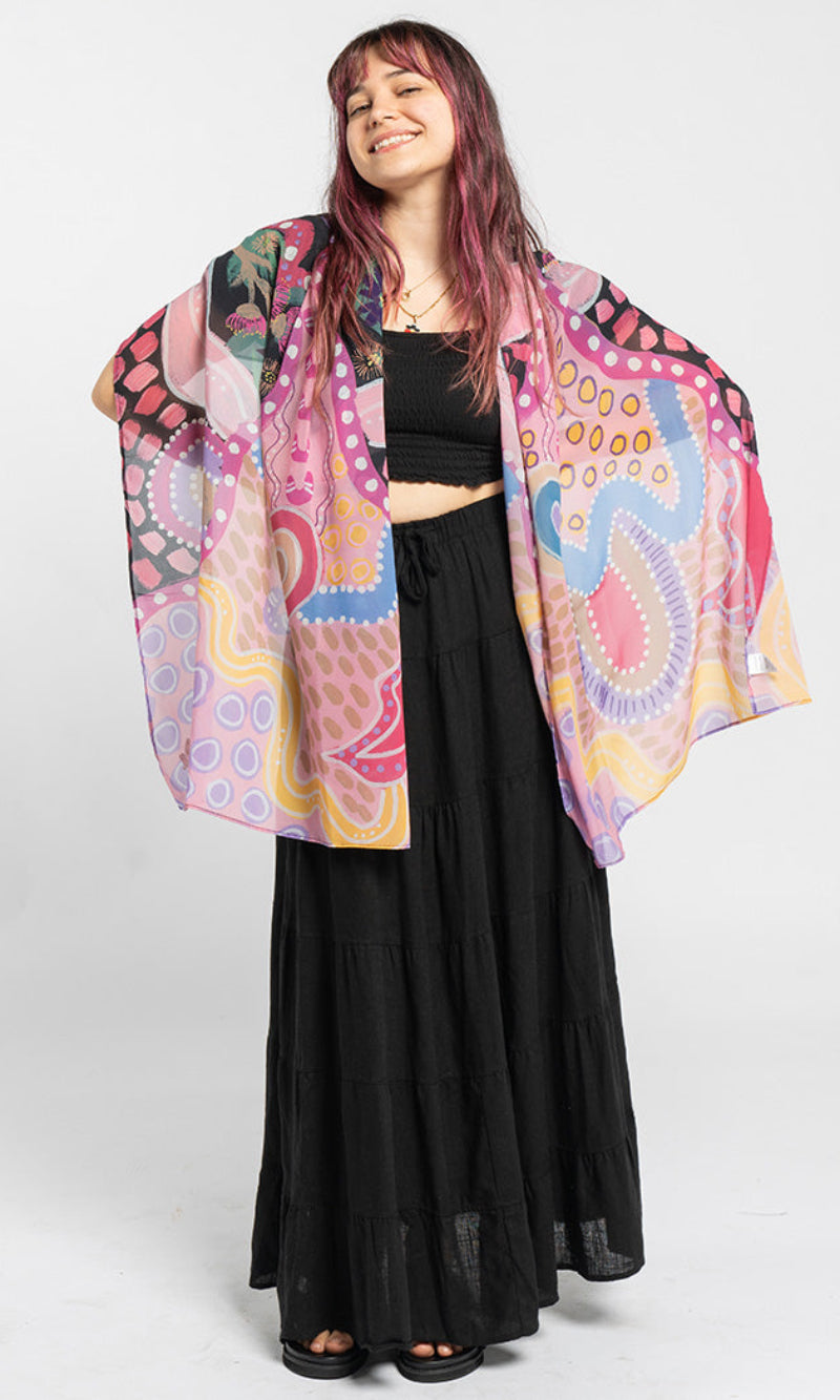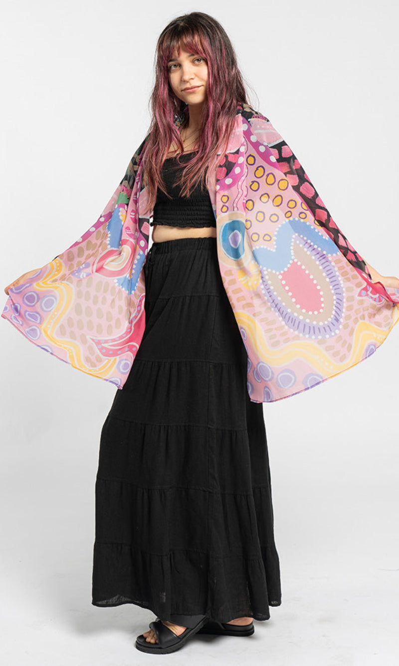 'Guiding Light' is a painting about strength, perseverance and a tribute to the strong community Caitlyn is lucky to be surrounded by. There are four campsites across this painting that each represent a community/place Caity feels or has felt immense strength and pride from. All of these places are connected through a journey line as they are all elements of Caitlyn's life that are connected to each other. Broken Hill and Adelaide are represented at the top and bottom of the canvas. She feels the strength and presence of Broken Hill every time she is with her father and is fortunate and proud to live on Kaurna country. The right campsite represents a previous school community she was a part of and pays respect to the deep connections she built and still has with many of the Aboriginal students and families there. The left campsite is representative of the community Caitlyn has yet to build and is a symbol of what she wants to create with her psychology career in the future. The little person facing Caitlyn, represents her son, Dusty. Within the centre of the painting, you can see four people represented and one star. Caitlyn wanted to pay tribute to three special mentors in her life, who have taught her to always be proud, strong and to remember that our fire was never put out. One of these people is represented through a star as they have passed away but their influence and guidance will always be felt by Caitlyn throughout her life. The river is seen throughout this painting and represents the Barka and the strength and connection Caitlyn feels to it. This painting is a reminder that after everything we have been through, the light and spark within us still shines bright. Caitlyn has been fortunate to learn and grow from leaders who show her their light and fire in everything they do. The fire within us can never put out, we are forever 'Blak, Loud and Proud.'