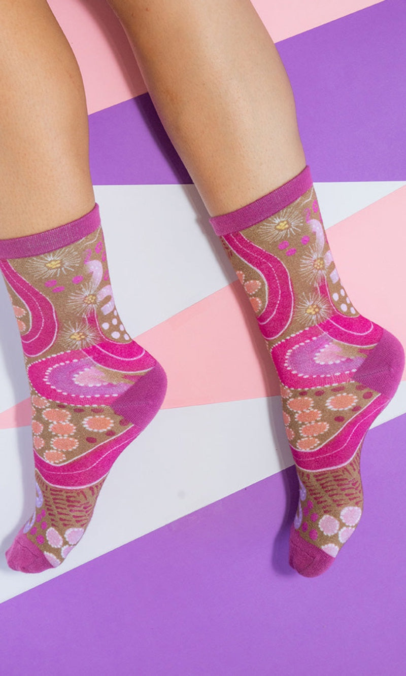 Add a bright and vibrant pair of socks to your wardrobe. Featuring beautiful designs of First Nations artwork, these socks bring a touch of colour to your outfit and will turn your neutral outfits into a fun and stylish look.