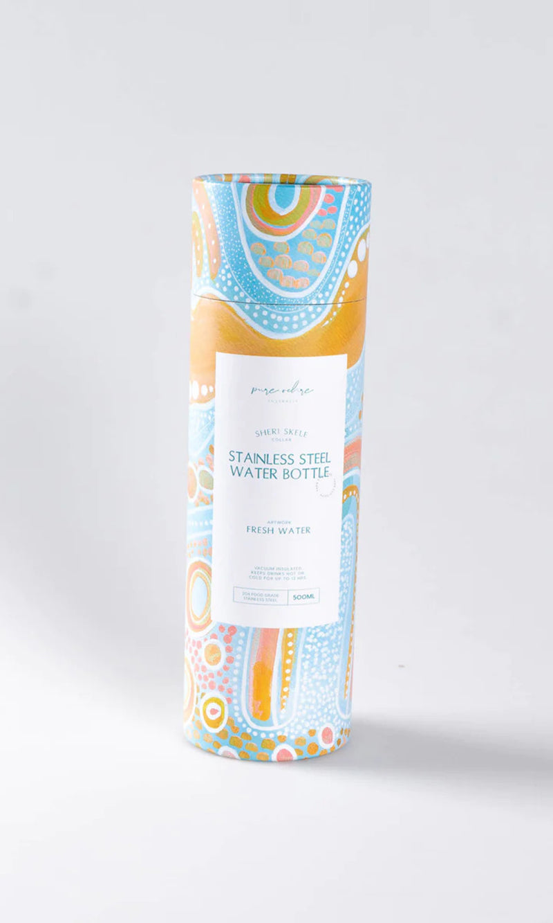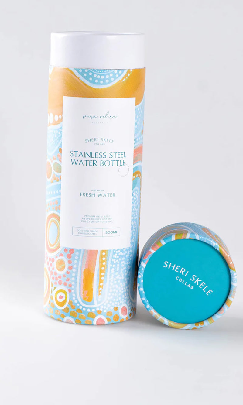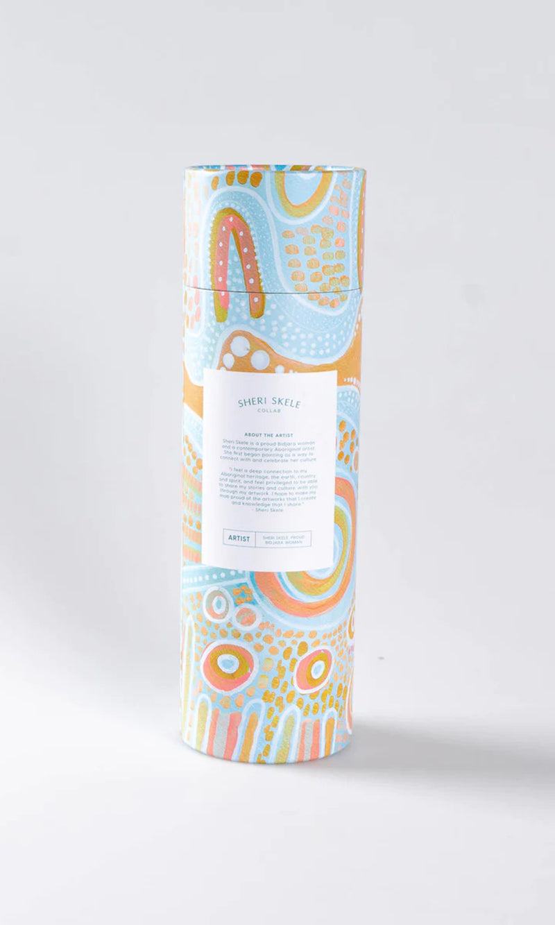 These bottles feature gorgeous artworks by Bidjara artist Sheri Skele. Her artworks express her deep connection with her Aboriginal heritage, the earth, Country and spirit.