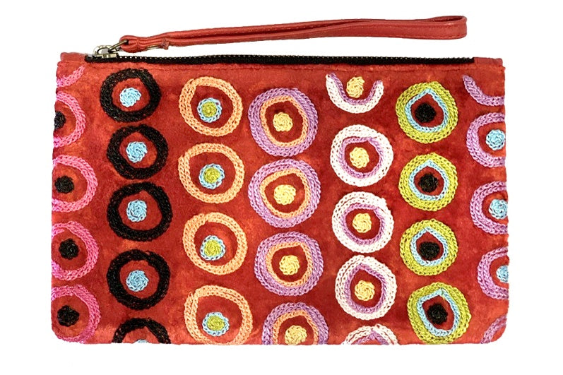 Aboriginal Art Embroidered Velvet Clutch with Wrist Strap by Daisybell Kulyuru