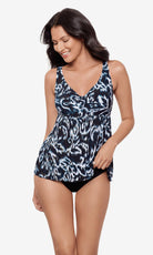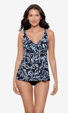 This slimming tankini features a fitted v-neckline bust concealing a supportive underwire bra. The apron hem skims over your midsection for a flattering silhouette.