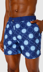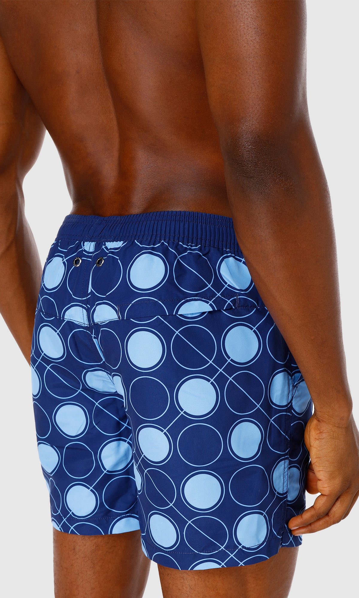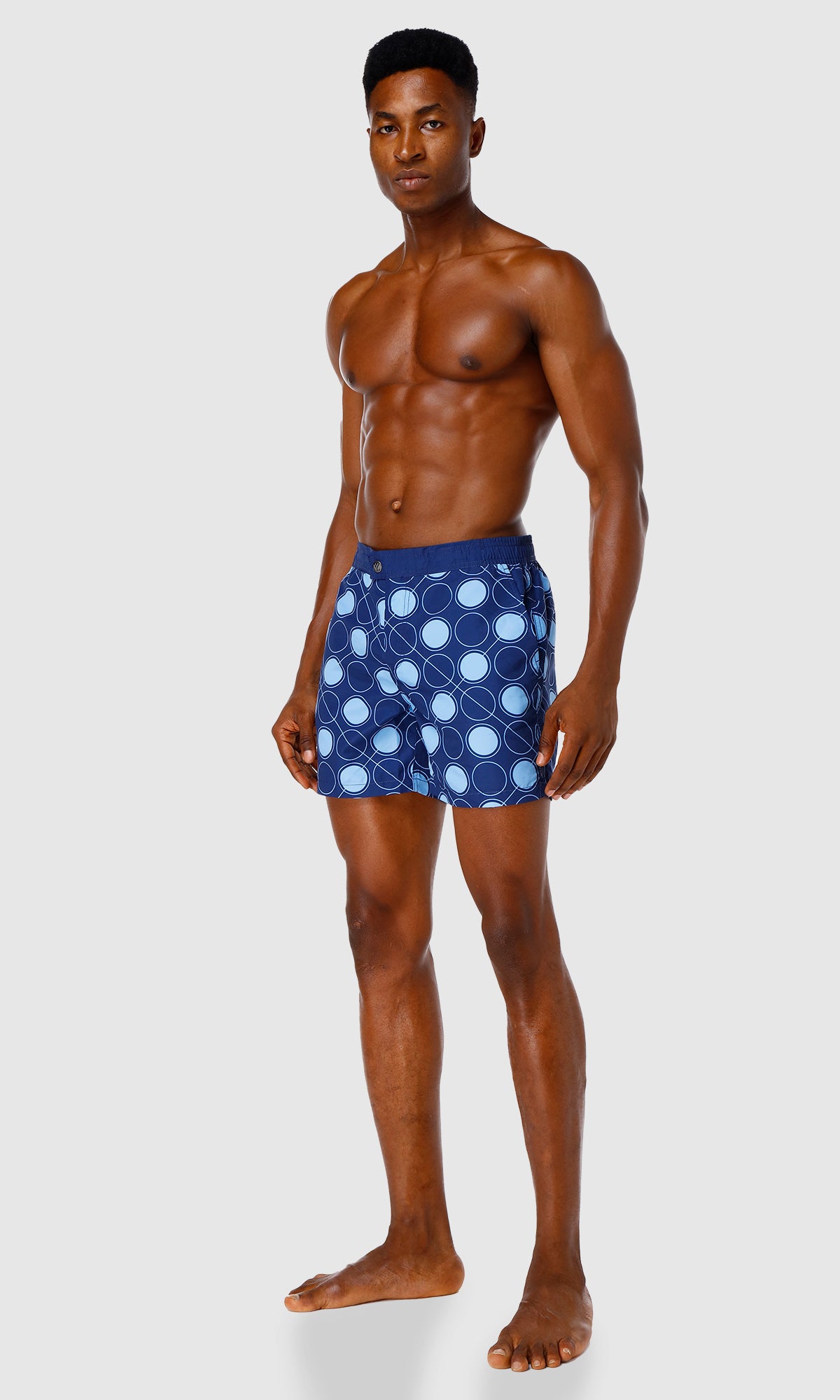 - These men’s printed swim shorts are like no other swim shorts you’ve tried before with an elasticated back waistband and flat front double secured with a press stud and white drawstrings and functionable front fly zip. Not only does this make them the most stylish men’s swim trunks but also improved function when you need it.