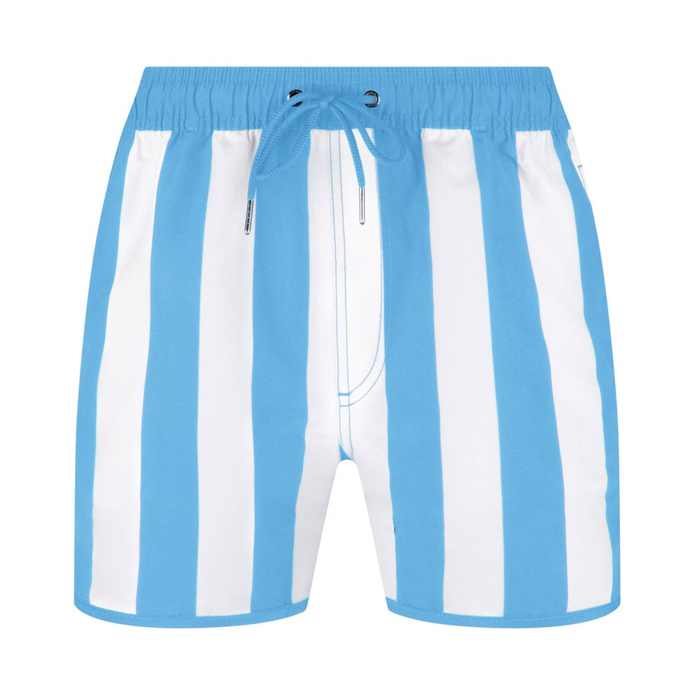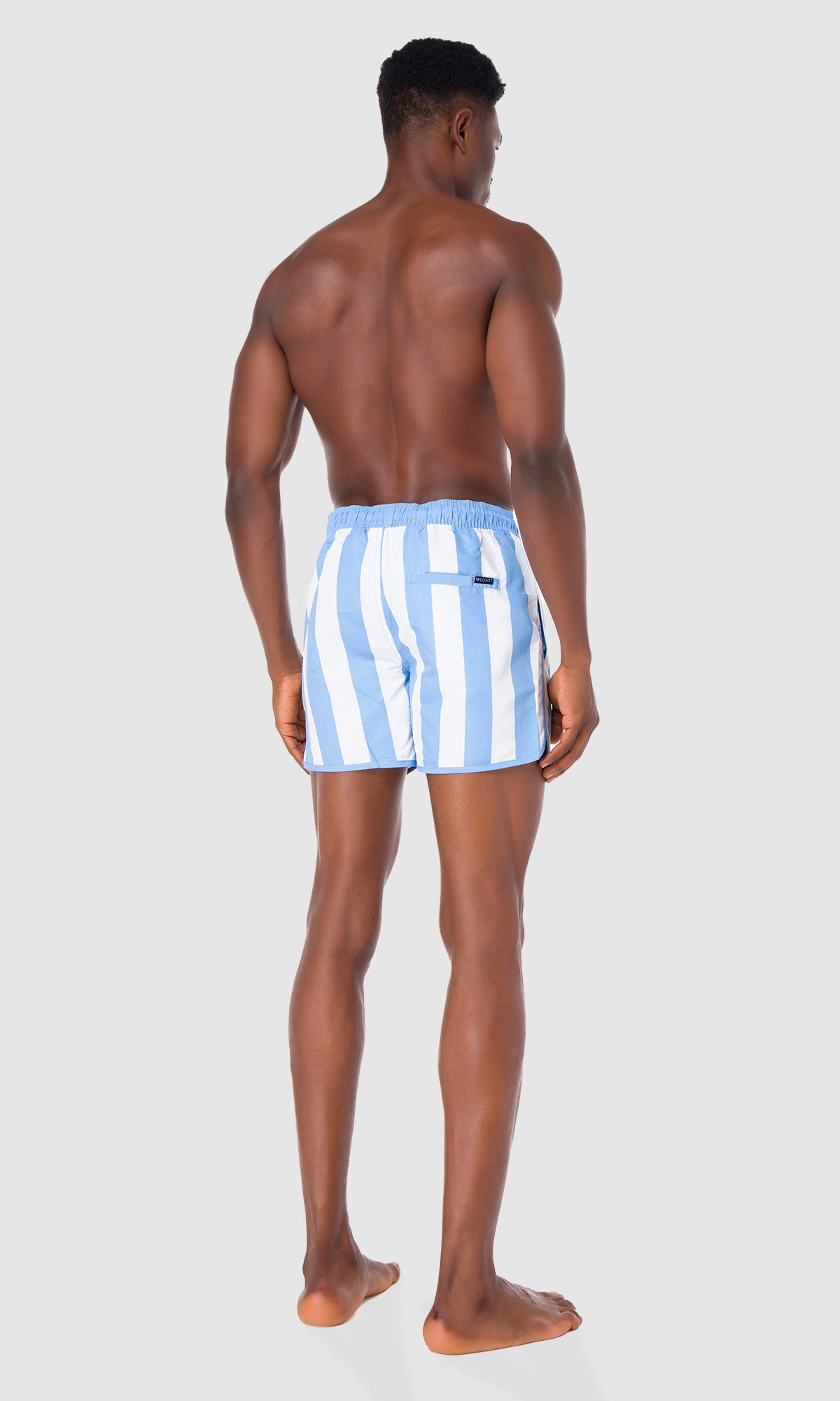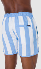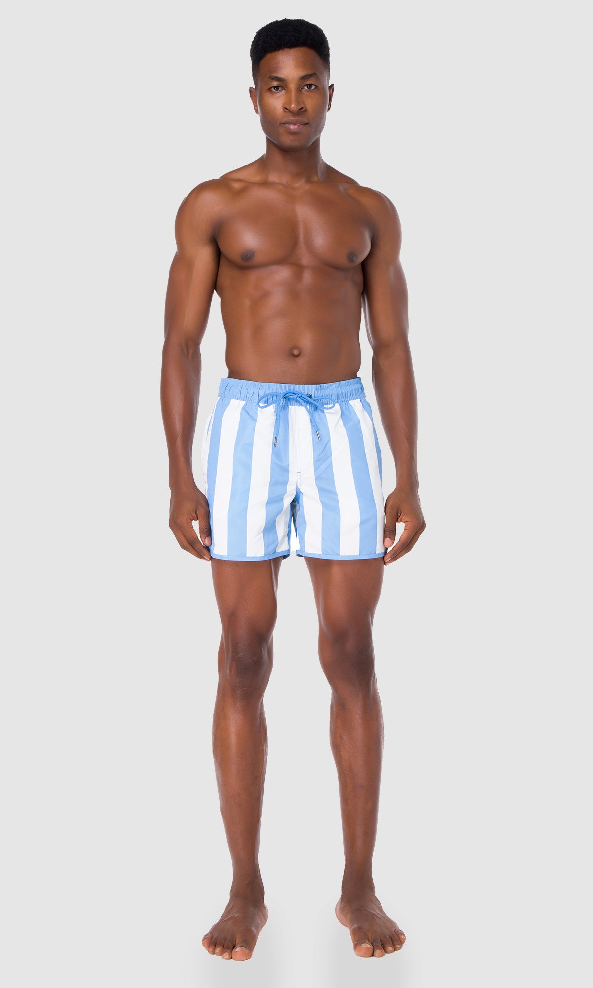 these blue and white striped swim shorts have that 80's short short vibe with curved hem so they're sure to turn heads at the beach! These blue and white striped men's swim shorts are not only stylish, but environmentally friendly. Perfect for a day at the beach or lounging by the pool. So not only will you look good, but you'll also feel good knowing your purchase is helping to reduce plastic waste. And with our Quick Dry fabric technology, these trunks will keep you comfortable all day long. So what are you waiting for? Dive into summer with the San Diego blued striped swim shorts. Available now at Coast Clothing.