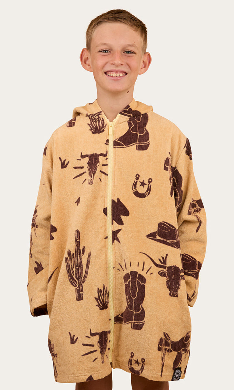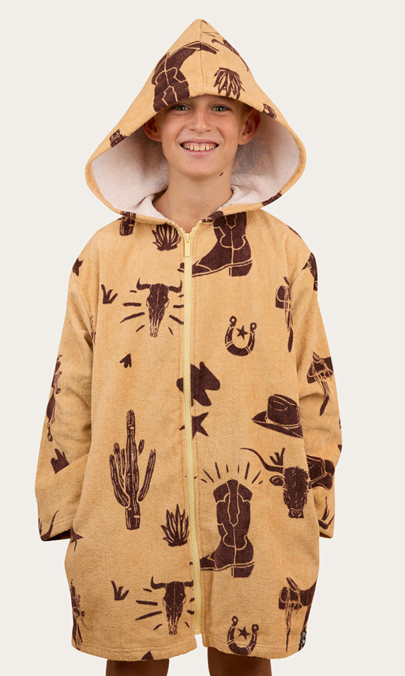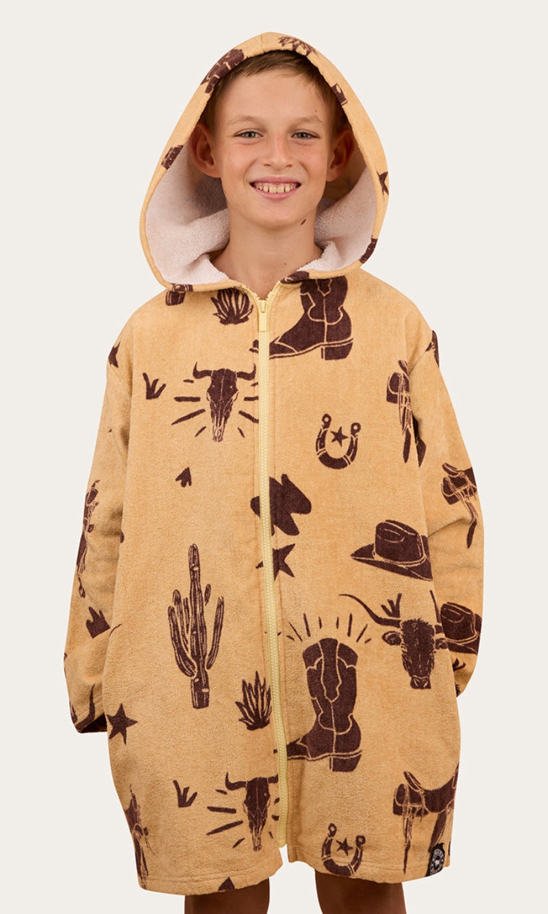 Thoughtfully created from a luxurious blend of plush cotton velour, this handy towel offers warmth and comfort whilst being highly absorbent. The zip-through, hooded design is practical and functional, allowing for easy wearing whilst on the move - perfect for rugging up after a day at the beach or heading home from swimming lessons. An all-over Western inspired print adds a playful, country touch that is sure to make drying off the best part of any aqua adventure.