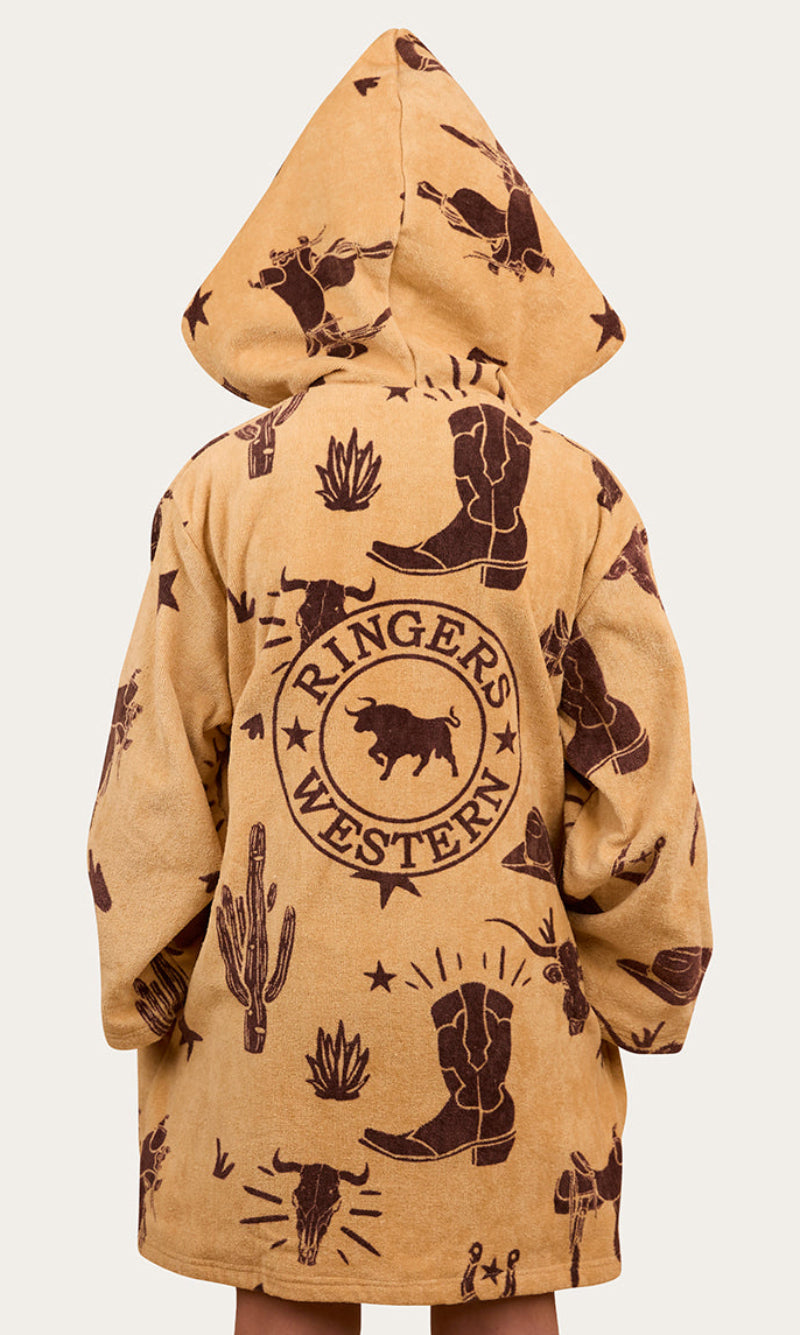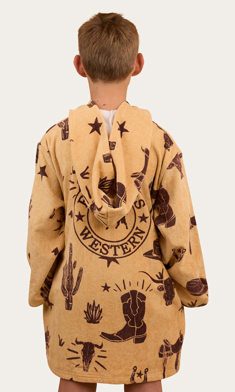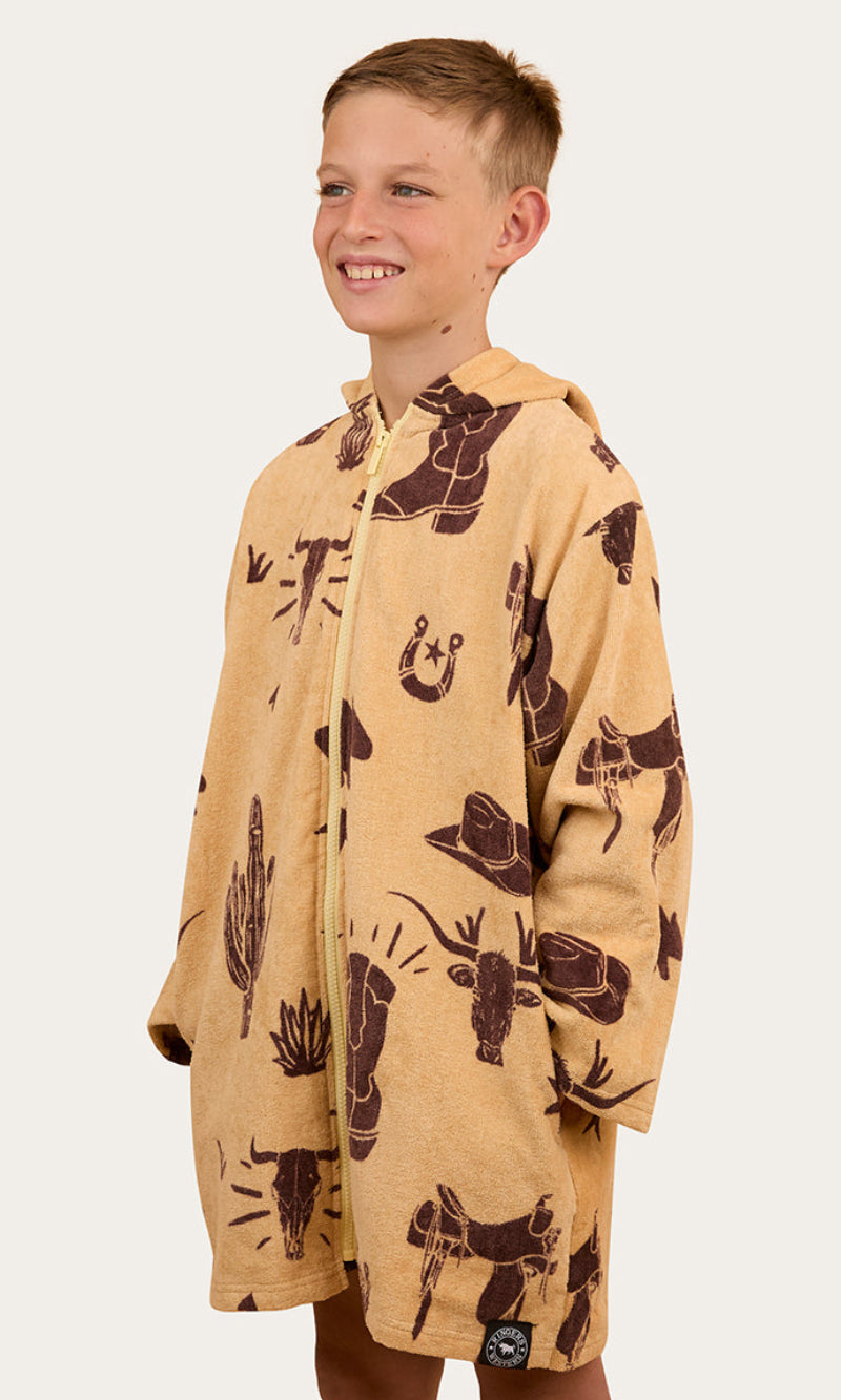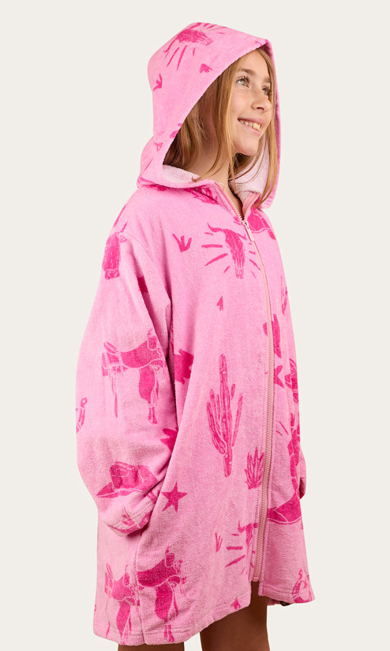 Thoughtfully created from a luxurious blend of plush cotton velour, this handy towel offers warmth and comfort whilst being highly absorbent. The zip-through, hooded design is practical and functional, allowing for easy wearing whilst on the move - perfect for rugging up after a day at the beach or heading home from swimming lessons. An all-over Western inspired print adds a playful, country touch that is sure to make drying off the best part of any aqua adventure.